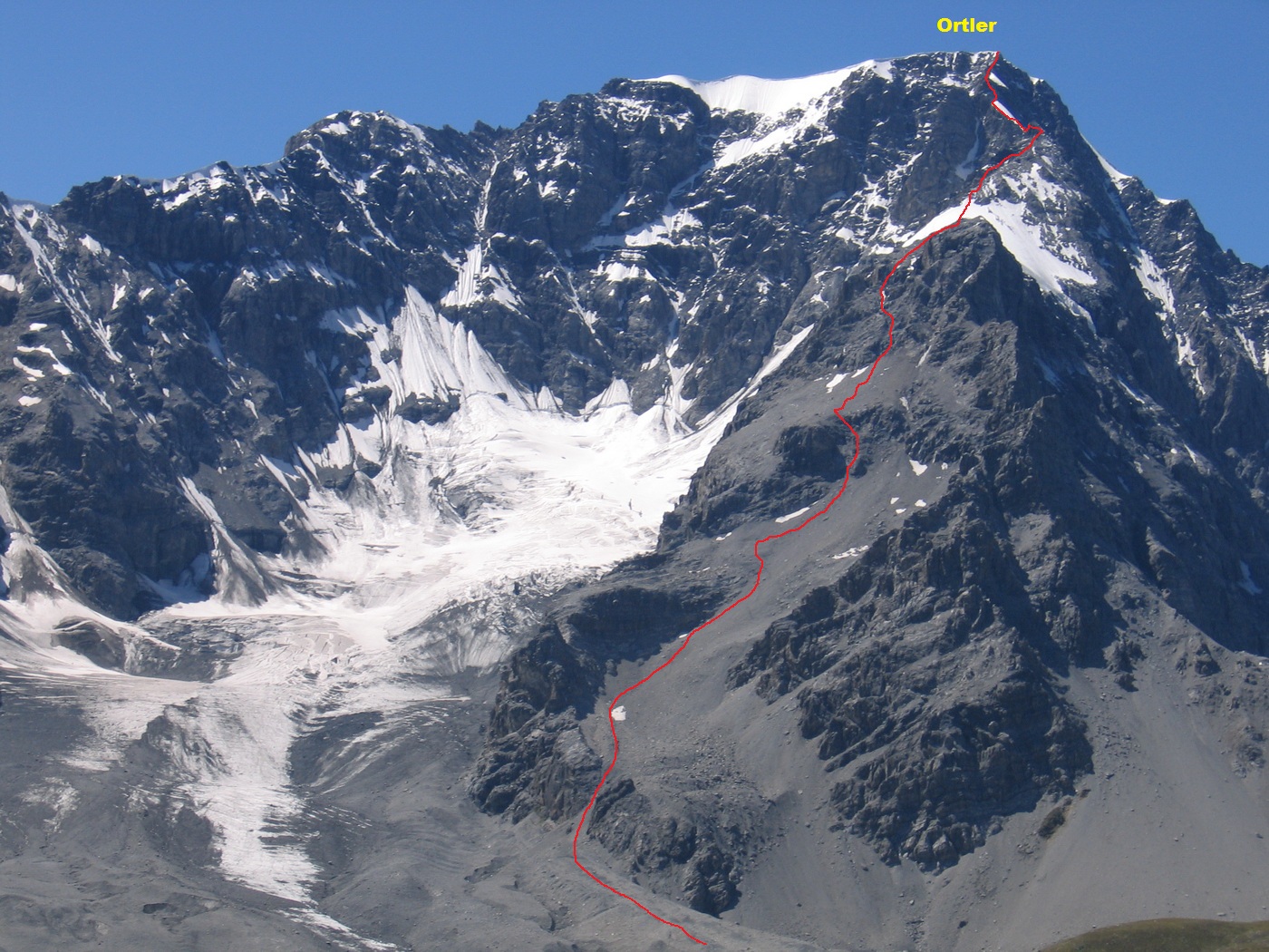 Od chaty prejdete vpravo popri jazere smerom k moréne ľadovca po vychodenom neznačkovanom chodníčku až na vysoký násyp morény. Po ňom až k úpätiu Ortlera. Tu vpravo slabo viditeľným chodníčkom strmo hore, až sa dostanete na široký suťový svah. Serpentínami po chodníčku hore. V závere skalný prah (cca 2+), po prelezení sa dostanete na ďalší sutinový svah. Na jeho konci začína lezenie cca 2+ a neskôr hrebienok cca 3. Stále sa držíte vľavo od výrazného hrebeňa, až sa naň dostanete v mieste, kde začína ľadovec.