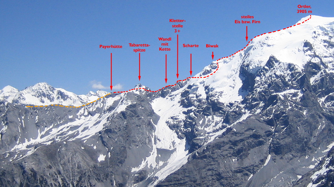 Štandardný postup pri tomto výstupe znamená deň pred samotným výstupom prísť na chatu Hintergrathutte 2661m. (rif. Coston) a na druhý deň skoro ráno vyraziť na traverz Ortlera. Tým rýchlejším sa podarí zísť do večera až dole do Suldenu, tí pomalší ostanú spať na chatách Payer 3029m., Tabaretta 2556m. alebo v tom najhoršom prípade v bivaku Lombardi 3315m.