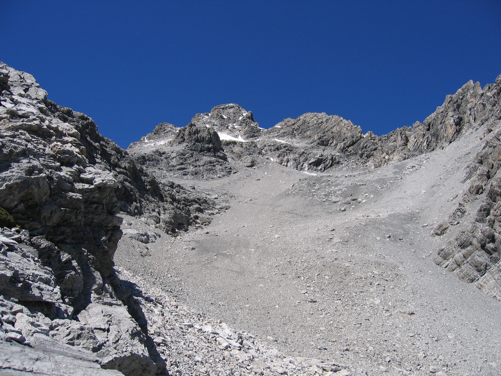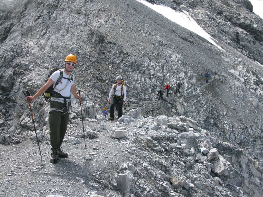 Tu pokračujete po ľadovci hore. Nie je to strmé. Išiel som to bez mačiek, ale závisí od podmienok. Ďalej sutinovým chodníčkom až pod výraznú vežu Signallkopf. Tu je prvé kľúčové miesto. Nenechajte sa nalákať na traverz vľavo dole pod vežou, ale pokračujte po hrebeni smerom hore. Pod vrcholom uvidíte výrazný zárez vľavo a ním treba zísť dole. Sú tam dva zlaňovacie kruhy, ale v prípade dobrých podmienok to nie je problém zliezť. Ďalej pokračuje traverz popod vežu naspäť na hrebeň. Toto bolo pre mňa orientačne najťažšie miesto. Aj keď som pred sebou nevidel žiadnych ľudí, pomerne rýchlo som to našiel.