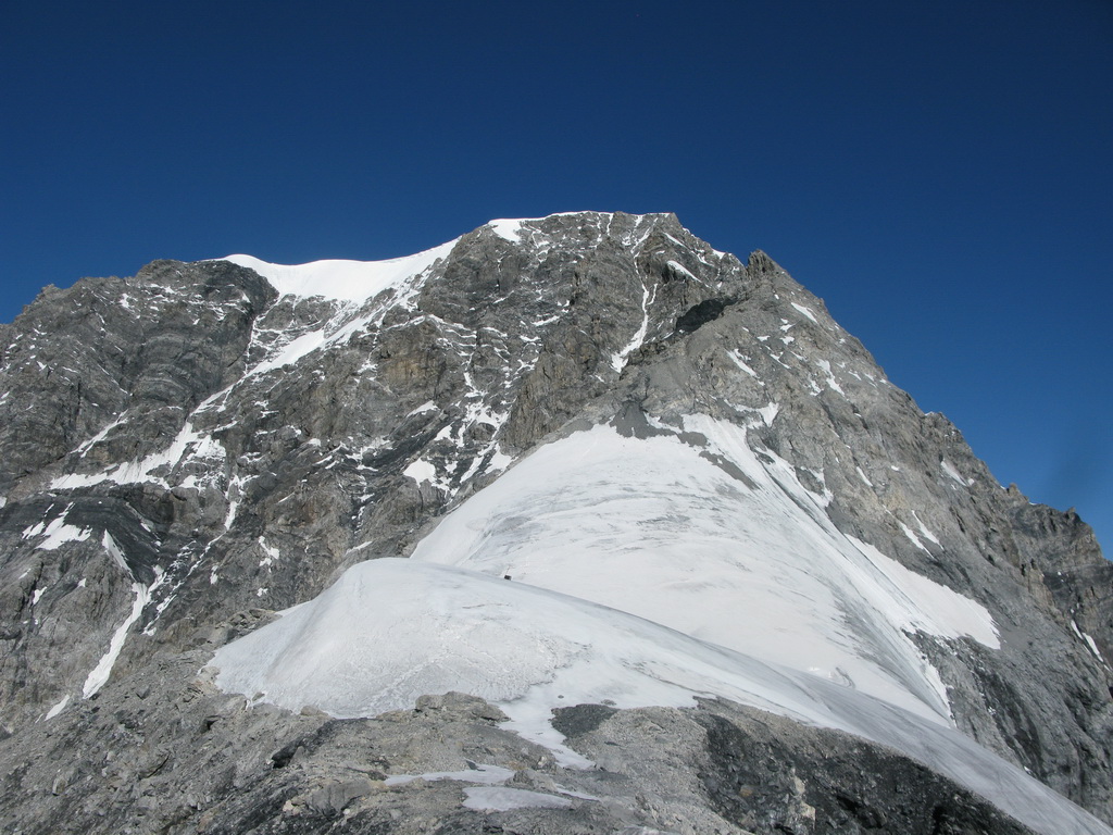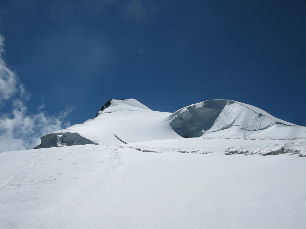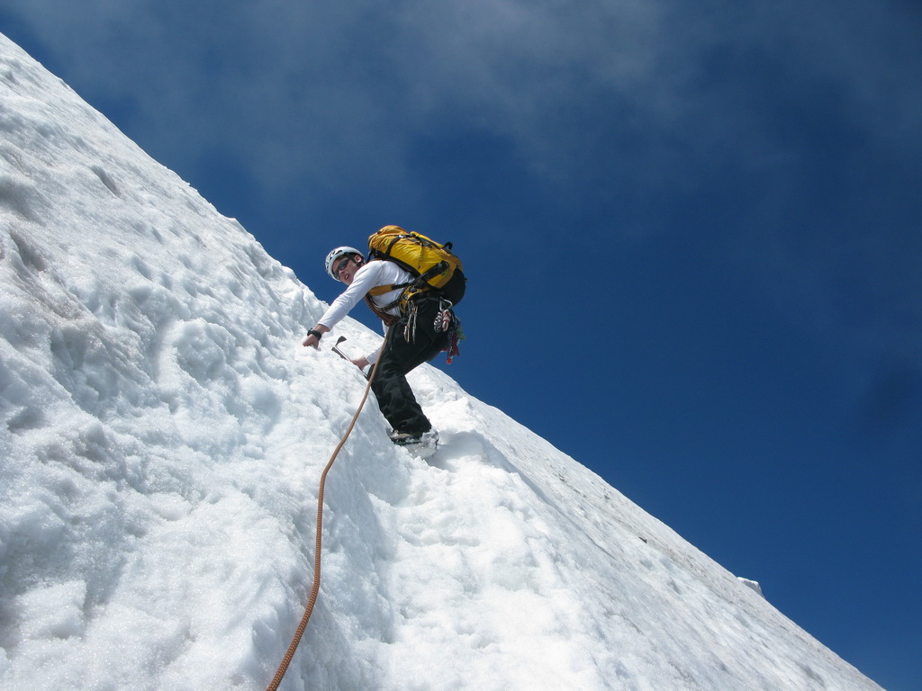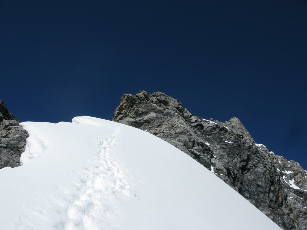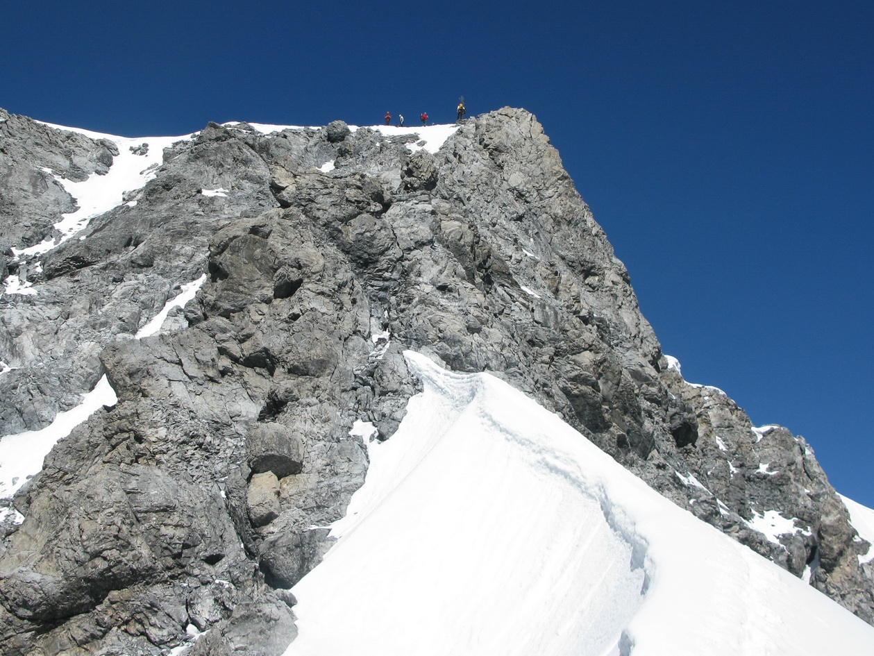 Po prelezení kľúčového miesta nasleduje najkrajší úsek. Veľmi pekné lezecké úseky (cca 3) až na vrchol. Prerušené je to druhým ľadovým poľom. Tu som mal prešľapanú stopu, bola dobrá a tak som mačky opäť nepoužil. Všimol som si že ľudia, ktorých som predbiehal, mačky nasadzovali, takže treba s tým rátať.