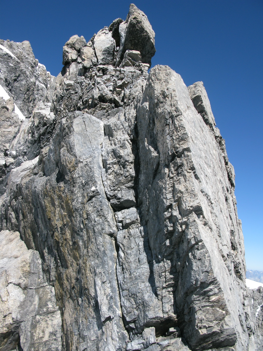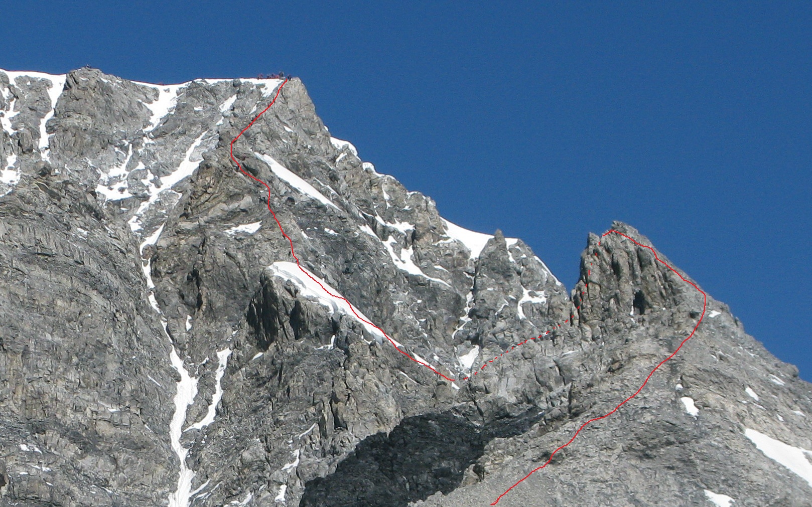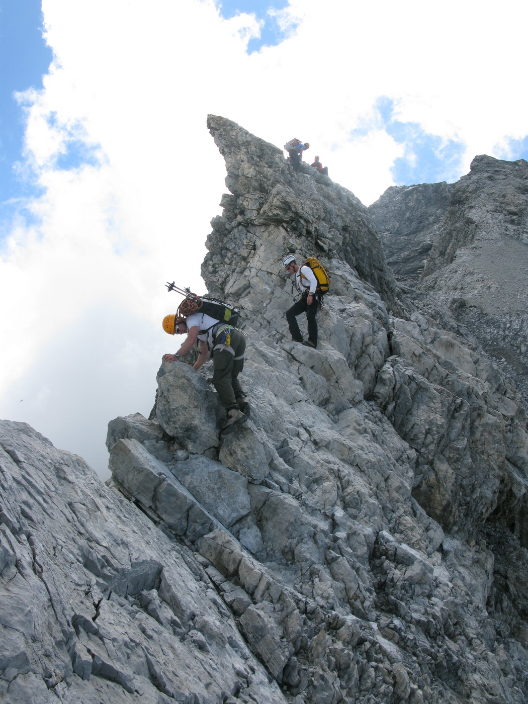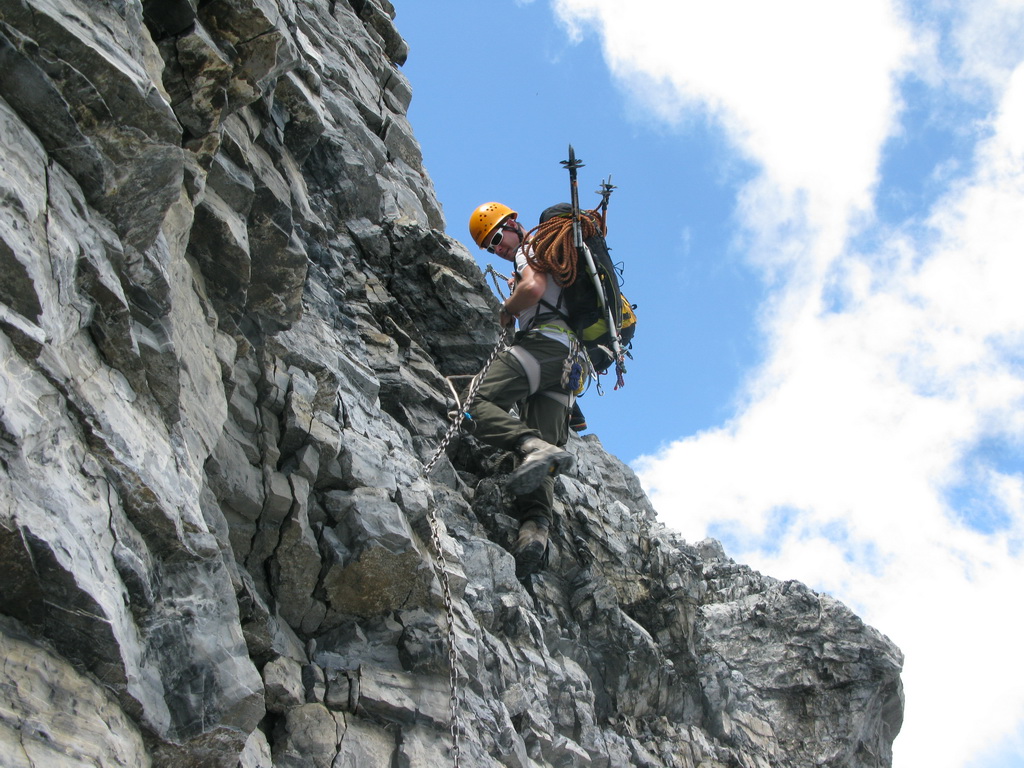 Tu sa dostanete na hrebeni ku kľúčovému miestu. Stienka so špárou obtiažnosti cca IV. V dolnej časti je zaseknutý friend, v strede zacementovaný nit a celkom hore nová strieborná reťaz. Expozícia nie je až taká strašná. Išiel som na istotu a preto som sa karabínou na dlhej sľučke cvakol do nitu. Doliezol som ku reťazi, chytil som ju jednou rukou, druhou som dočiahol nit a odcvakol karabínu. Vo vibramkách je to už také normálne lezenie, čiže skúsenosti s lezením sú potrebné.