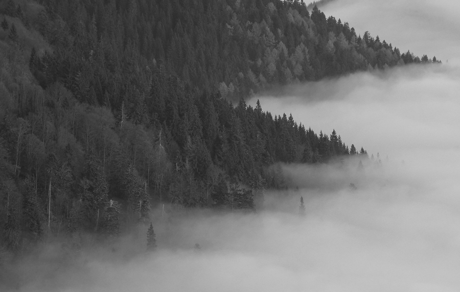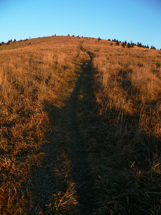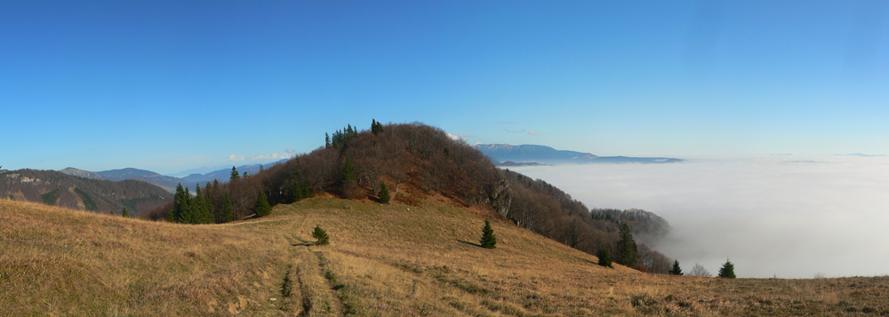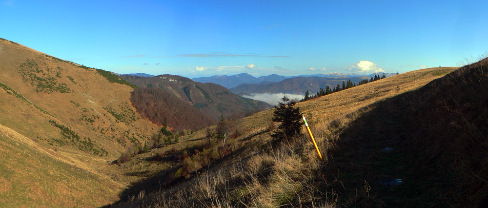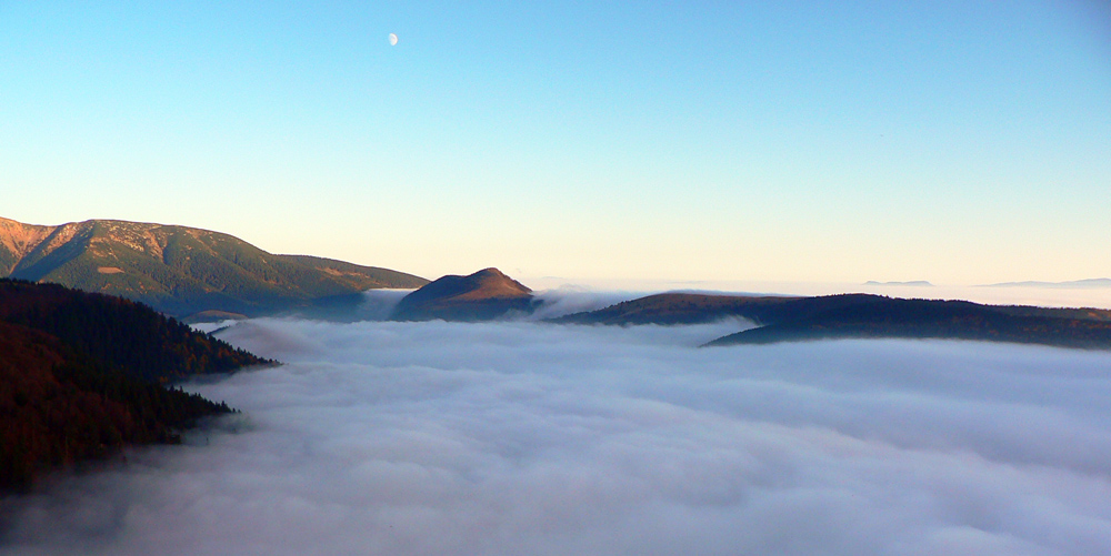 Najskôr síce len rúbanisko, ale potom už lúky okolo Motyčskej hole s výhľadmi na mliečne more na Donovaloch. Pripomína to kráter sopky pred erupciou, z hmly sa totiž nesie poriadny hukot hlavnej cesty a hladina sa hýbe vo vlnách - ako jazero lávy. Hrebeň „krátera“ tvoria Motyčská hoľa, kde sedím na okraji lúky, Zvolen, Prašivá, Kozí chrbát a Kečka. Len na juhozápad je „sopka“ otvorená, ale to mi zakrývajú stromy. Dole musí byť hnusne, veď si to večer vychutnám... Ale tu je ticho a teplúčko v zapadajúcom slnku.