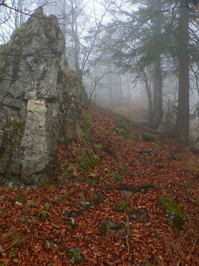 V Rybovskom sedle som takto asi o 2 hodiny, čaká ma asi polhodinka pochodu po holiach s výhľadmi a potom ponor do lesa, najmenej na dve hodiny. V mojom prípade aj do hmly, ktorá sa ako vodopád tlačí z Horehronia do Revúckej doliny. Aj s patričnými „efektami“: kým na holiach je sucho a teplo, v hmle fúka, zo stromov regulérne prší, zima zalieza za nechty. Podvedome zrýchľujem. Tretíkrát tadeto idem a zatiaľ som vždy zmokol :-)