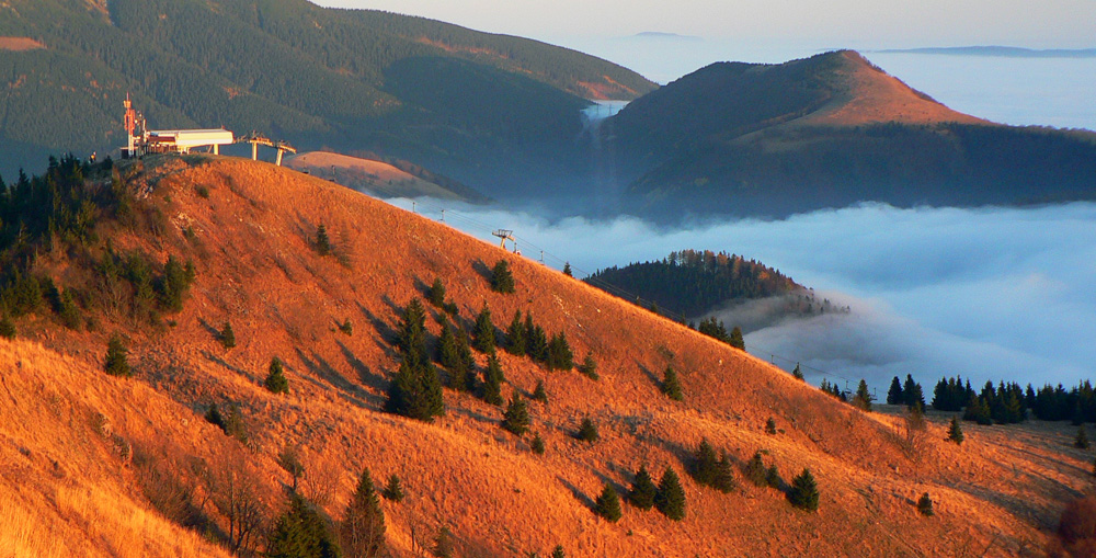 Posledné strmšie stúpanie a som na Zvolene, akurát na vychutnanie západu slnka. Zlatá hodinka je v najlepšej fáze, aj vedľa pri lanovke vidieť ľudí, ako cvakajú spúšťami o sto šesť :-) Keď sa zlatá guľa skryje za Flochovou, neostáva nič iné ako pomaly sa ponoriť do toho šedého mordoru a dúfať, že na konci dušičkovej nedele bude v niektorom zo „študentských“ autobusov do Bystrice miesto - aspoň „vzadu na nárazníku“.