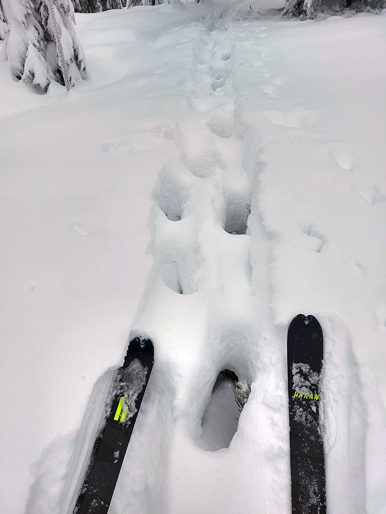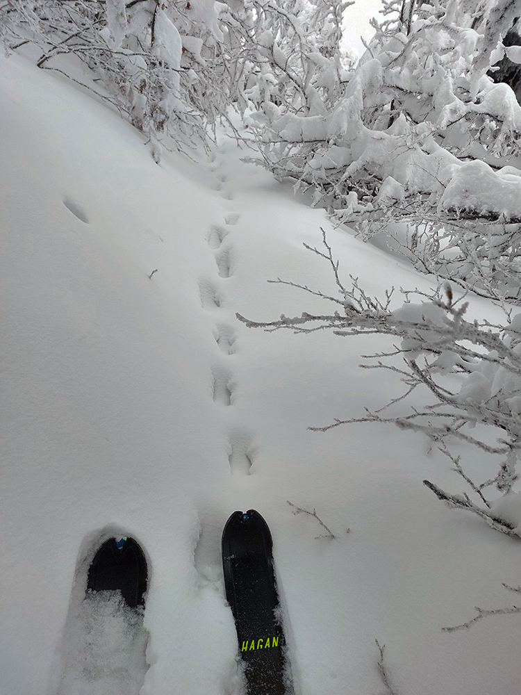 Pri lanovke ceduľa, že zákaz vstupu na zjazdovku, chodia tam ratraky. No, za rannej polotmy ešte nechodili, ale zúrivo tam syčali delá, rešpektoval som – a teda nastala ďalšia improvizácia: direkt hore popod lanovku, na Medvediu cestu. Už na pásoch, stopa komfortná, ale na cestu dole to práve tu nebude. To bude treba zbehnúť po svojich, pomedzi to všetko, čo okolo trčí spod snehu.