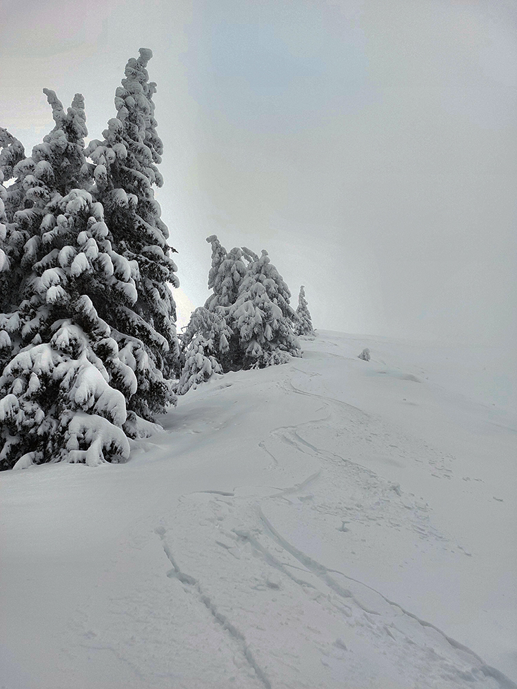 Vynorenie do Južného Rakytovského sedla bolo zároveň ponorením do poriadneho mlieka. Stopa nikde, brázda za lyžami ostávala hlboká, ďalšie spomalenie. Ale veď keď nestihnem Tureckú, aj spod Ploskej do Revúc sa dá stočiť. Pohodka. Lenže vpredu neviditeľný traverz riedkolesom poza Žiare, a tam nastala po dlhšom čase ďalšia improvizácia. Lebo sneh poohýbal miestne jarabiny do nepriechodna. Tak obchádzky vrchom, spodom, kadejako. No ďaleko som nedošiel.