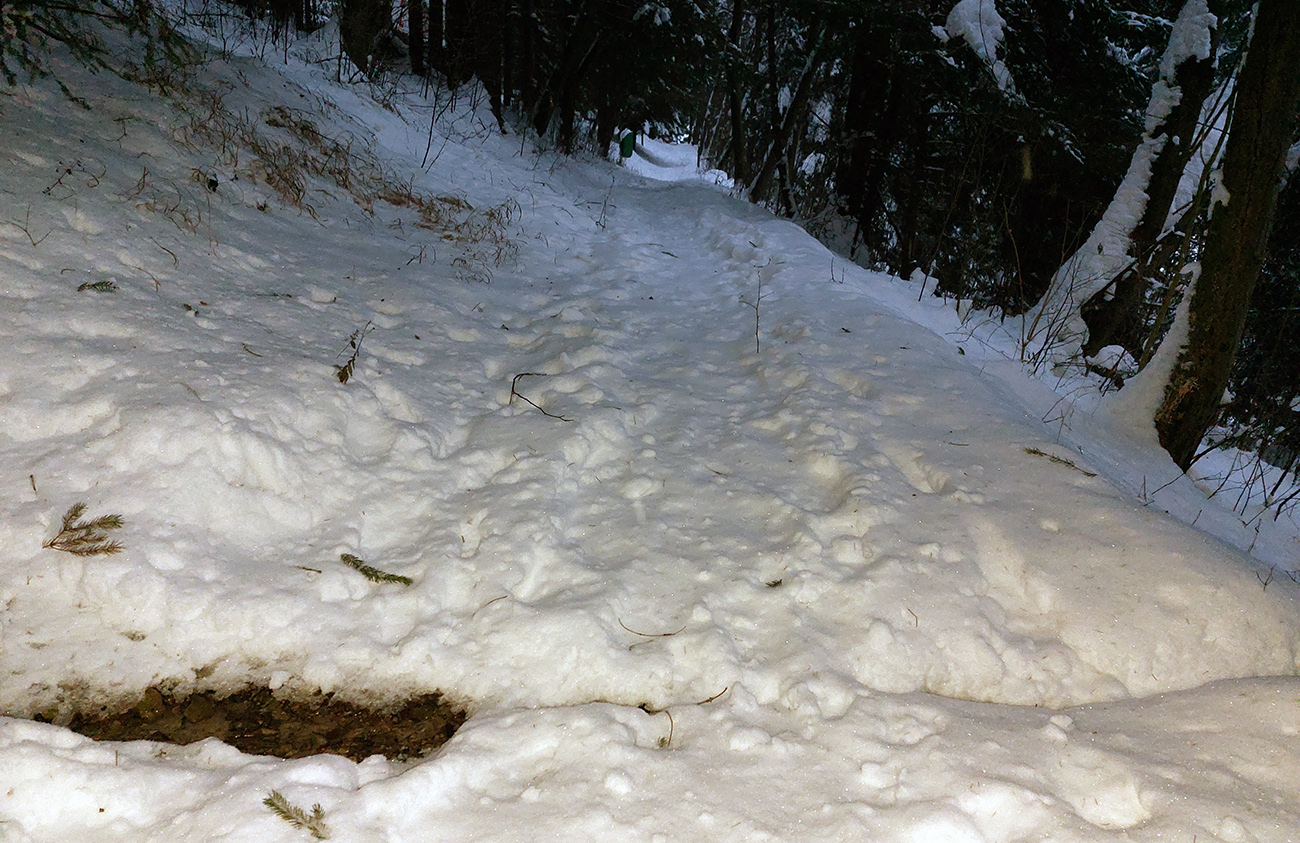 Prvá improvizácia hneď na chodníku do Hrabova: normálne by sa to dalo na pásoch, aj v lese snehu dosť a pekne utlačeného. Skoro nič netrčalo, aj tie prechody cez pramienky vysnežené – takto začiatkom zimy som to ešte nezažil, dobre to začína! Ale keď už boli lyže na batohu, neriešil som, aj tak bude treba prenášať cez parkovisko. Len som si zafixoval, že ak by som cestou nazad náhodou nestíhal ku vlaku, môžem sa tu zrýchliť.