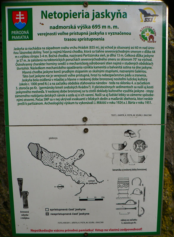 Rútim sa dolu kopcom z Panského Dielu, hlboko podo mnou sídlisko Sásová - Rudlová. Míňam strojovňu vleku a o chvíľu sa chodník ponorí do lesa. Najprv vedie po východnom svahu zalesneného Hrádku. Keď sa prehupne na západný svah a vyjde na malú, zarastajúcu lúku, treba si po pár metroch dobre všimnúť nenápadnú, ale od roku 2012 už oficiálne označenú odbočku prudko doprava, po vrstevnici. Tá po pár sto metroch prichádza nad zráz nad dvojicou jaskýň. Kaplnka je vyššia, Netopieria hlbšia (44m) a krajšie vyzdobená (aj visiacimi netopiermi). Pred tou druhou je aj tabuľka s nákresom jej pôdorysu: z hlavnej chodby, zakončenej Galériou a Kancľom, sa odpája kratšia Partizánska sieň. Bralo s jaskyňami je prírodnou pamiatkou, ale od roku 2008 s povoleným vstupom. Jaskyne majú bohatú a archeológmi doloženú minulosť, už v praveku sa tu žúrovalo. Našli sa tu pozostatky keramiky zo 4. storočia, bronzové nástroje lužickej kultúry spred 3000 rokov aj zvyšky ľudských obetí. Nálezy z mladšej a neskorej doby bronzovej súvisia s hradiskom, ktoré stálo na Hrádku. Podľa bordelu naokolo sú jaskyne aj dnes miestom opiášov a zvyšky jedla samozrejme lákajú všelijakú „dzivú zver“, takže pozor! V zime je na dne oboch jaskýň bohatá ľadovo-stalagmitová výzdoba. Po prieskume sa odtiaľto netreba vracať nazad na značku, ale neodporúčam. Nenápadný chodník vedie síce od jaskýň aj smerom dolu - do Sásovskej doliny, ale cez zaváľané rúbane, žihľavu a lopúchy. Napája sa na traverz, ktorý z horného konca doliny (z asfaltky) vedie lesom popod jaskyne na lúky nad Sásovou a tam sa napája na modrú turistickú značku. Presne na tú, ktorú som pri zostupe z Panského Dielu opustil smerom k jaskyniam.