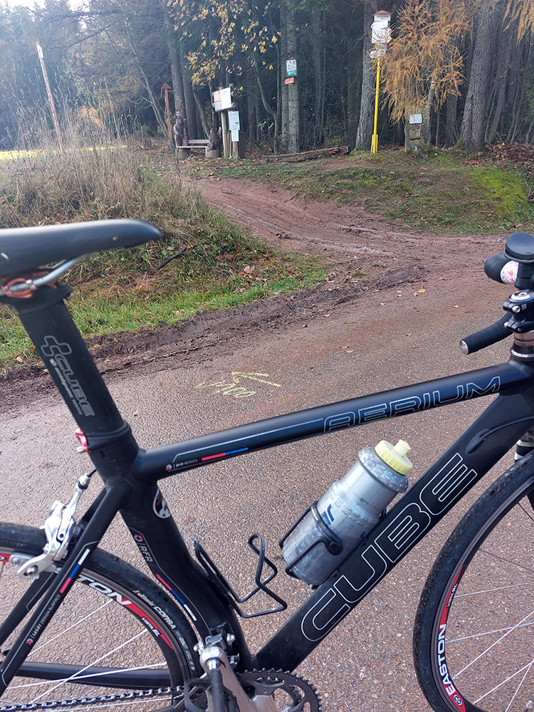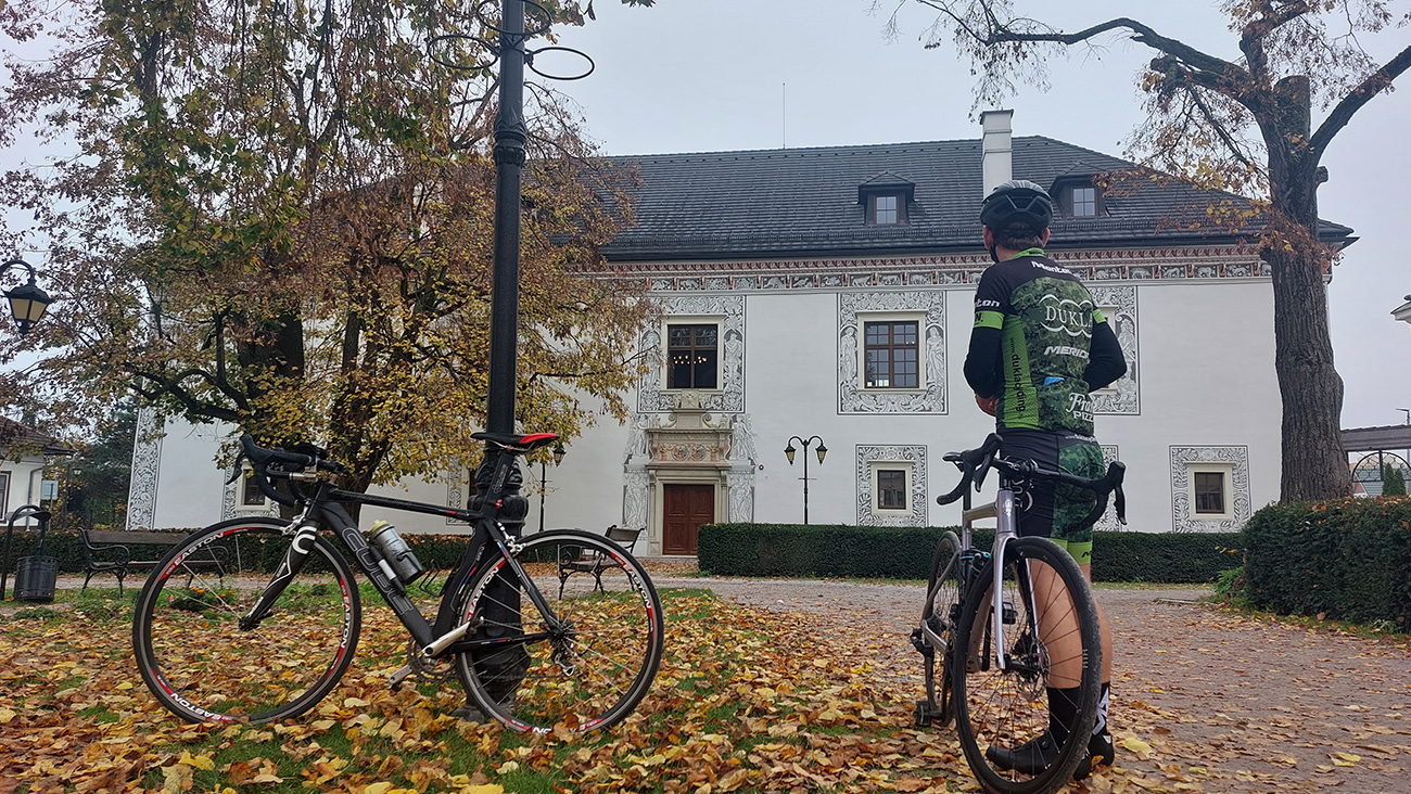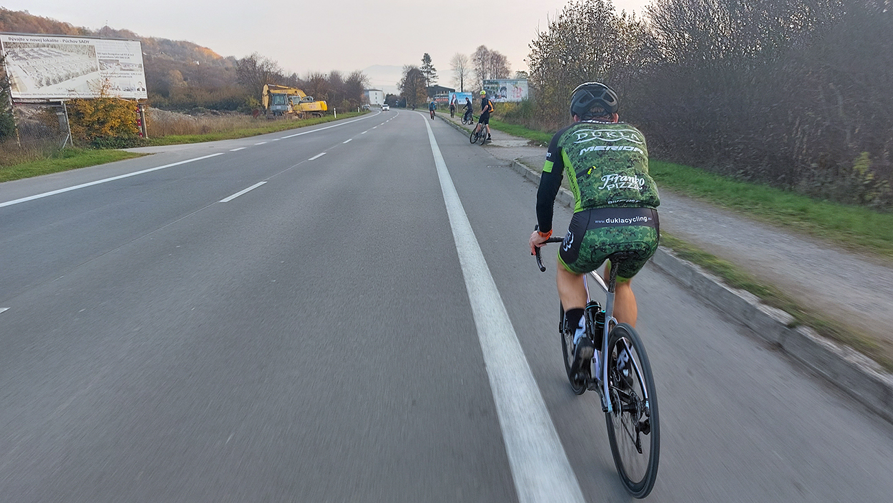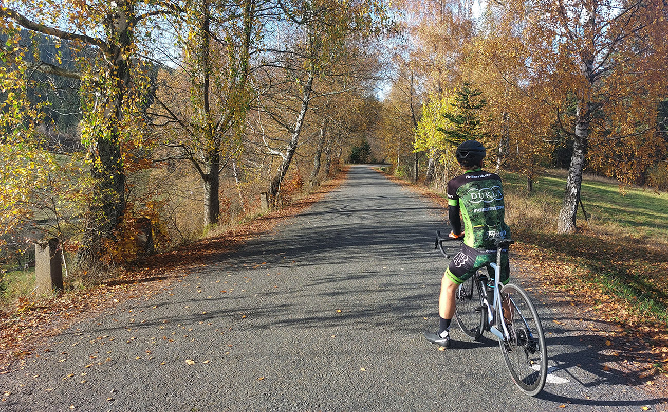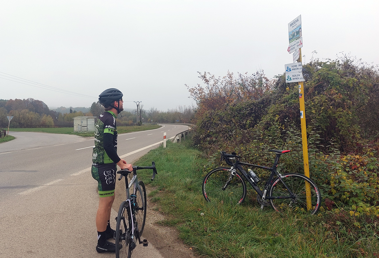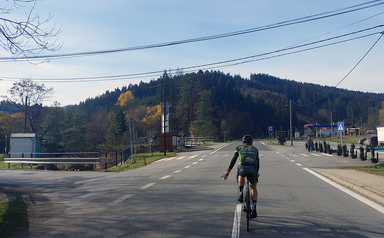 Cesta dole, jeden zážitok! Najprv mačacie hlavy ako na Roubaix, potom gravelový úsek po rozbitom asfalte. Asi preto som zabudol po pauze zapnúť hodinky, hehe... Veď ten záznam aj tak vyzerá. Popred hraničiarsku hliadku (ozbrojenú ako do vojny) sme radšej prešli bez nadávok a potichu, lebo by odhalila, že sme imigranti a ktovie, čo by bolo... S vynorením z lesa prišlo aj krásno – pod kolesami aj v okolí. Akási je tá krajinka na druhej strane hranice lepšie udržiavaná oproti tej našej. Aj nové domy s väčším vkusom budované, aj okolie ciest upravené a tak... K tomu slnko do chrbta a farby kalendárové.