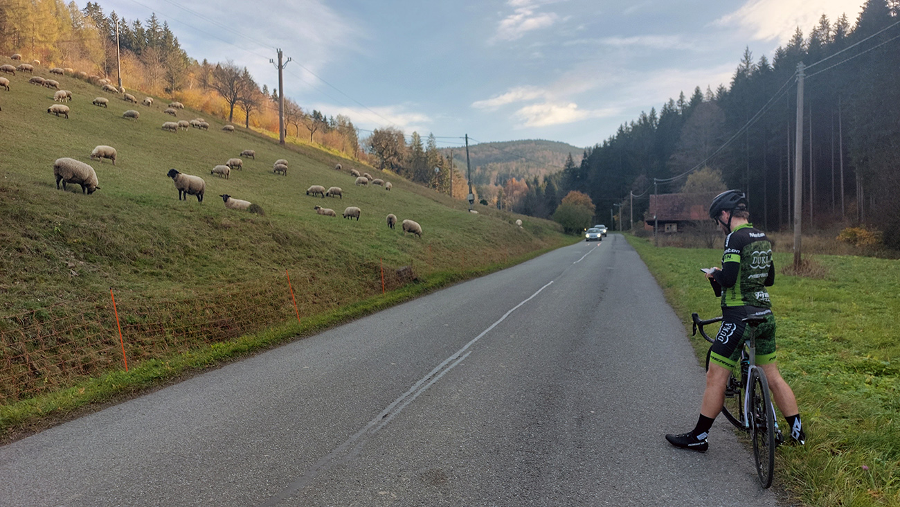 Lebo na začiatok mierny sklon pomedzi domy a ovce a kone a pasienky a celkovo príjemné vozenie. Ale keď už mi došli ľahké prevody, zrazu odbočka a čo sa pred nami za stena postavila, tomu som skoro neuveril... Že som si ja nedal tú námahu naštudovať si trasu poriadne vopred – hneď by som ten okruh naplánoval opačne! Tri kiláky lámania kľúk ako v spomalenom filme z Tour zo šesťdesiatych rokov, otáčky blízke nule a na pár miestach (just najstrmších) zase ten slizký asfalt v tieni. A niekto si tam vpredu v pohode vrtel nohami, s prevodmi ako na mtb, že?