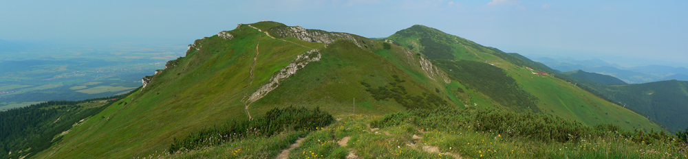 Jedno horúce júlové ráno som teda odštartoval zo železničnej zastávky v Šútove, ale tá je od vstupu do lesa dosť ďaleko - takže úvod asfaltový. Sú dve možnosti, zvolil som dlhšiu (cez dedinu), ale radšej ako po smradľavej hlavnej. Smer Šútovský vodopád - tadeto je to hore na Chleb príjemnejšie ako po zelenej, po „Generáli“, na ktorý už zrána praží slnko. V doline pri vodopáde akurát vrcholila jar, mesačnice voňali o 106, nad lesom zas prudko rozkvitli lúky. Voda sa dá dotankovať cestou na hrebeň, na Mojžišových prameňoch. Tam sa dá aj reuma liečiť, lebo chodník je tam úzky a žihľava dobre narastená :-) Stúpanie je okolo prameňov strmé a až príliš slnečné a v závetrí. Takže keď za posledným horizontom vykukol Chleb, nešiel som traverzom popod neho k chate, ale doprava hore na hrebeň, do Sedla za Hromovým. Predpoklad sa naplnil – dobre tam fúkalo. Hneď bol svet krajší! Aj výhľady: ako na dlani Vrátna dolina a jej západná obruba, ktorú som sa chystal prejsť. Predo mnou pekne po poradí Chleb, Veľký Kriváň, viac vpravo Kraviarske, Žitné, Baraniarky a celkom vzadu Sokolie. Ale všetko v opare, vlhko bolo ako v práčovni, obloha biela, fotky nič moc, čo už... Počkáme na babie leto.