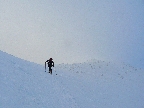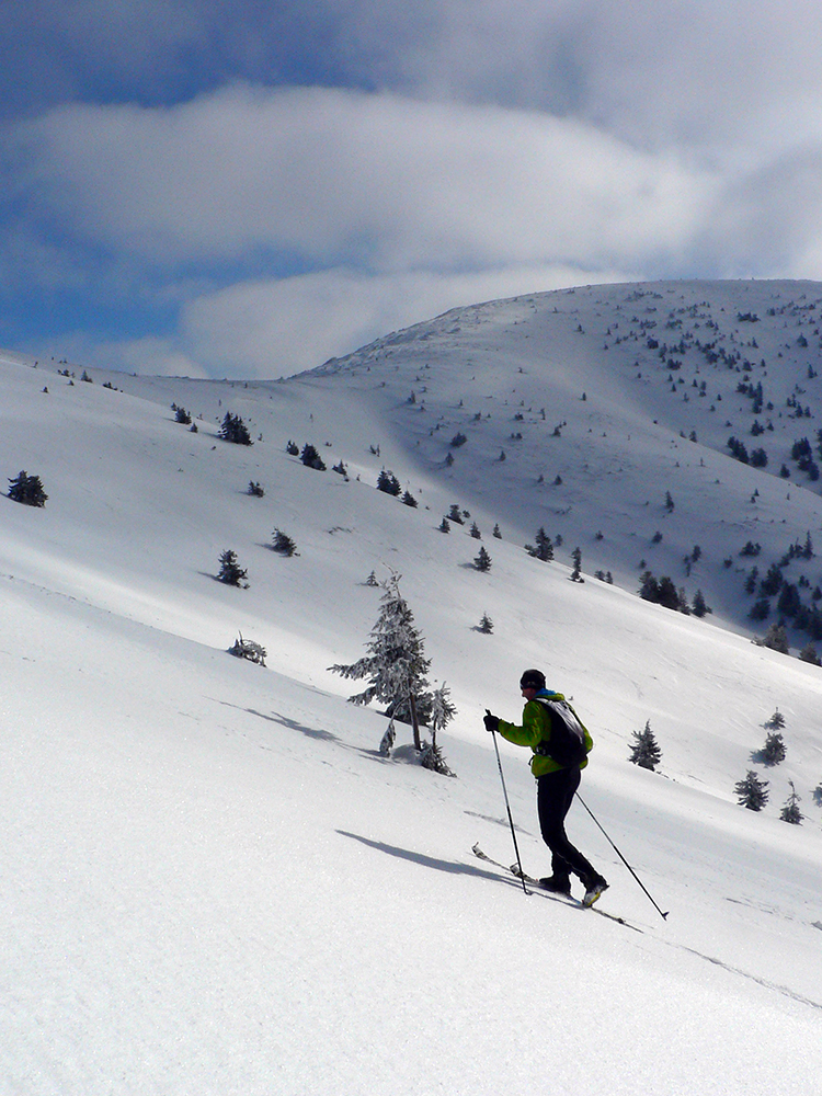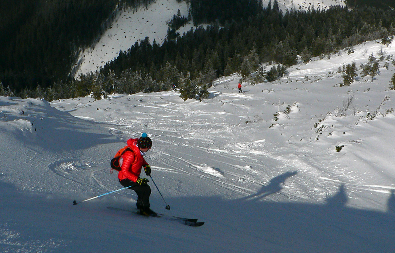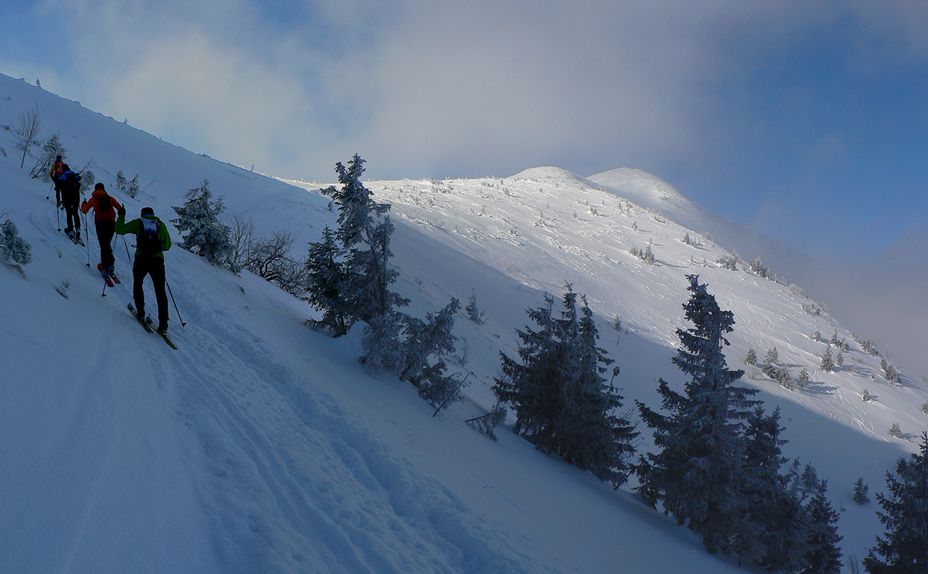 No mali sme byť traja, nakotilo sa nás päť. Na môj samotársky vkus poriadna banda, ale všetko známe firmy, niekedy neuškodí aj takáto „masofka“. Mal som tam byť za sprievodcu, ale známa firma „Majster Z“ sa vyzná lepšie, najmä po kadejakých miestnych zbojníckych chodníčkoch, grúňoch a dolinách. Tak som s radosťou prijal úlohu vzadu sa vlečúceho a miestami z predposledných síl nadbiehajúceho fotoreportéra. Lebo počasie vyšlo na jedna mínus. Jedna preto, lebo aj na hrebeni vládlo bezvetrie, slnko čoraz viac prepaľovalo rednúce mraky a dobré snehy sa dali nájsť ľahko. Mínus preto, lebo nepieklo ani na južných svahoch, slnkom opekaných, v podstate stále bolo mínus a keď už okolo obeda začal prašanček na tých juhoch trošíčka naznačovať, že by snáď mohol aj lepiť, zdrhli sme definitívne do severov.