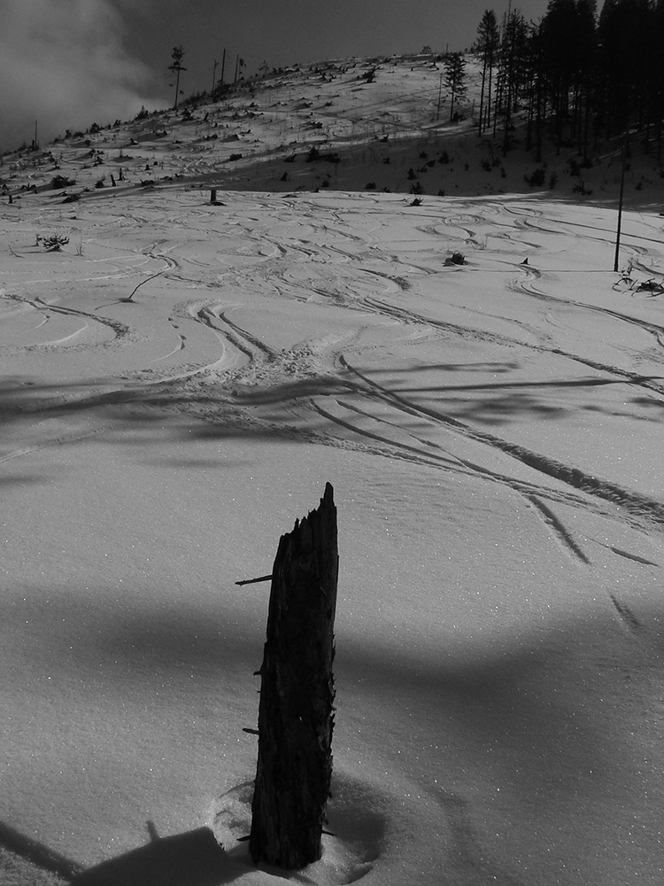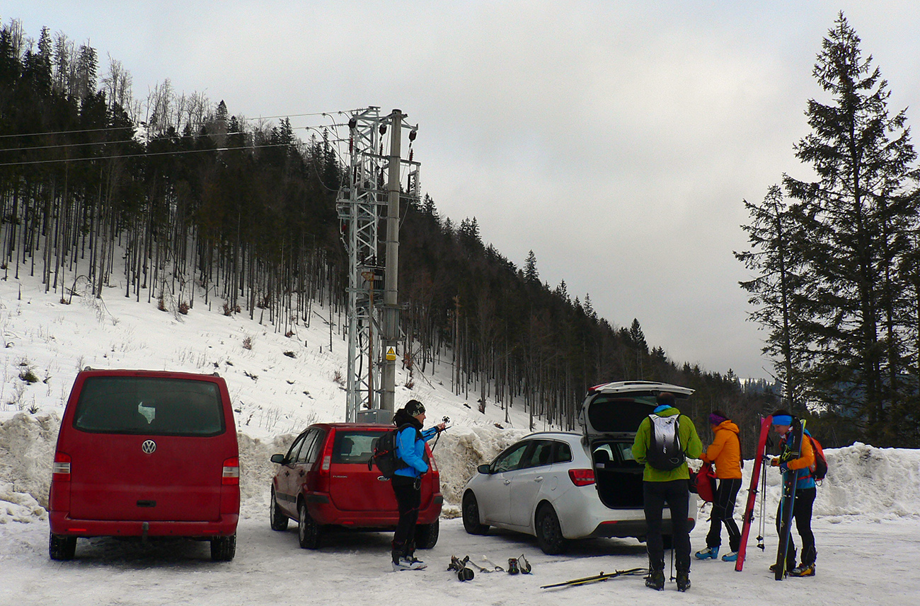 Takmer presne po roku som sa „vrátil na miesto činu“ (odkaz dole), ale teraz už dve expedičné autá sme zapichli vyššie, priamo v sedle Prievalec na takmer prázdnom parkovisku. Len rozospatý pohľad z jedinej prítomnej dodávky nás obviňoval z radosti asi príliš nahlas prejavovanej - pri chystaní do akcie. A sme teda vyrazili: stopy preleštené, aj v lese špina prikrytá novým popraškom, na rúbaniach hygienická bieloba, ešte takmer nepokreslená. Samozrejme som z čistej zaneprázdnenosti zabudol zapnúť hodinky.