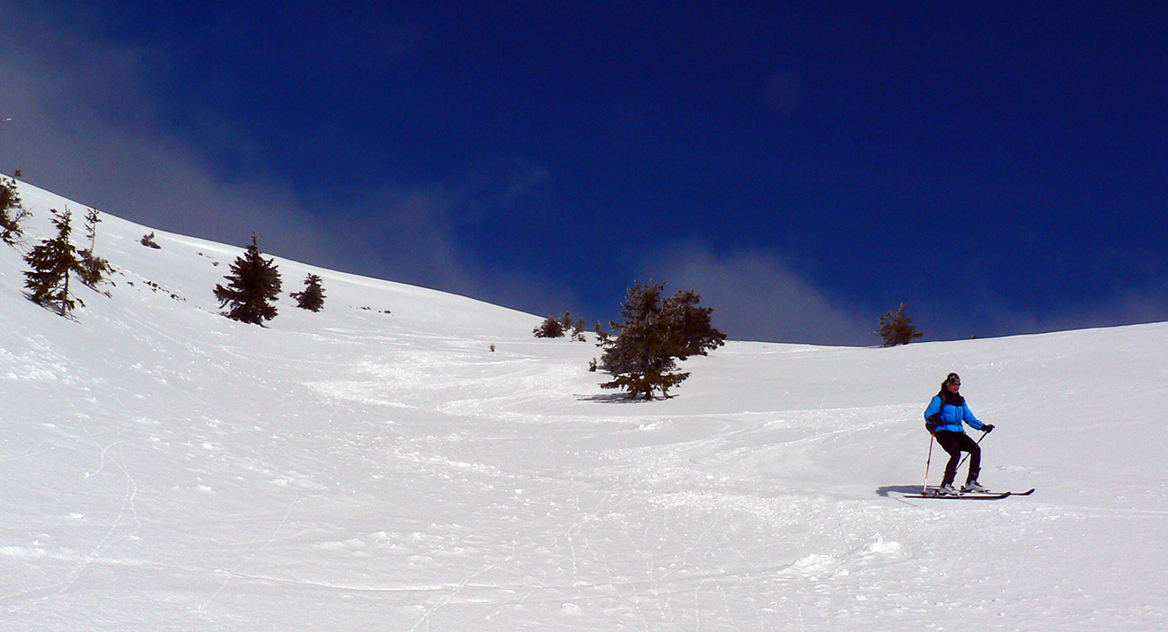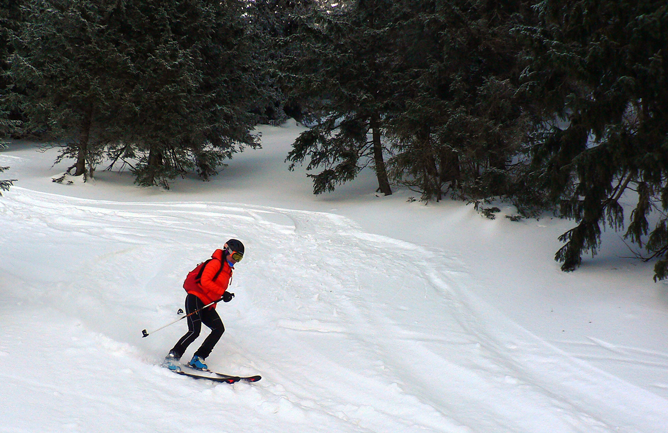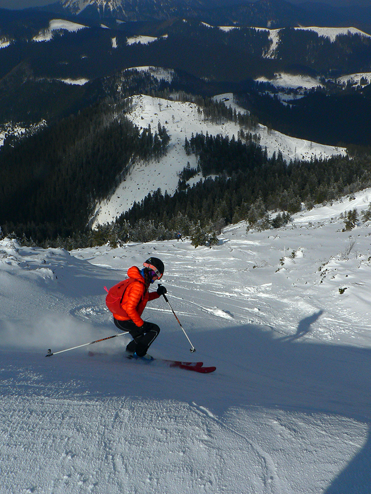 Po niekoľkých krátkych prestávkach na vydýchanie (alebo taktických poradách) padla prvá voľba na Latiborskú hoľu, ktorej temeno bolo na počudovanie viacerých normálne ZASNEŽENÉ a netrčalo tam skoro nič!!! No ci beka! Takže očkávanie smerom dole na JZ bolo viac než veľké a celkom sa aj splnilo. Hore ešte to pod tenkou vrstvou škrípalo a nedržalo, ale ako sme sa norili do tieňov, norili sme sa aj do snehov. Zase žiadna hlbočizná orba frírajdová, len proste príjemné oblúky.