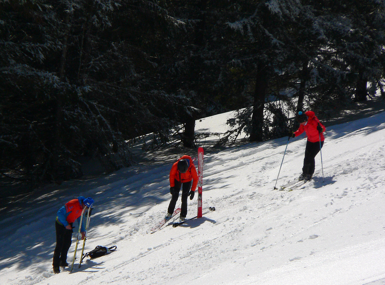 Tak zas hore, takmer rovnakou trasou, a zas do juhov, tentokrát už kratšie a už aj za občasného hlasnejšieho premýšľania nemenovaného najslabšieho kusa, že by to dnes aj skrátil, keby sa vraj nehanbil. Ale juhy lákali a z jamy stopa nazad hore už natiahnutá (a nie jedna, už sa tam veeeľa farebných bodiek po okolí motalo). No nebol to už priamo prašan, ale lyžba fajná a aj ten vlhnúci sneh akosi lepšie držal nemenované vychlpené pásy smerom hore, ako predtým.