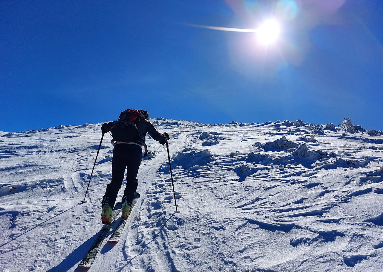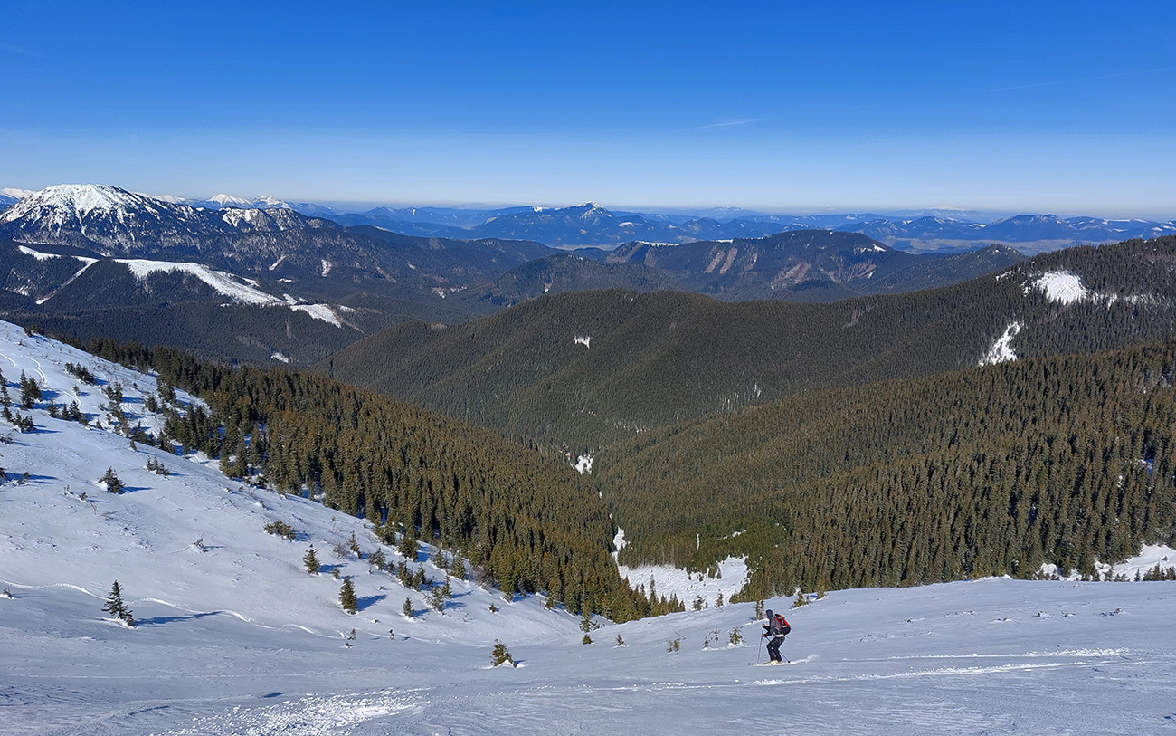 A tam samozrejme dilema, že kade hore. Zhodli sme sa napokon, že to vezmeme zľava a keď sa vyššie rozkukáme, uvidíme čo ďalej. Napokon sme to tam otočili dvakrát. Prvá jazda v parádnom prašane na tvrdom podklade, priamo do severu. Druhá trochu horšia o „zjazdovku“ vedľa, aj nejaké kôrky už za nohy ťahali, orientácia svahov už hrala podstatnú rolu. Ale slniečko sme videli po dlhej dobe konečne inak ako len cez okno pracovne, to bolo hlavné. A teplota ideál, aj vietor len osviežoval, nemrazil.