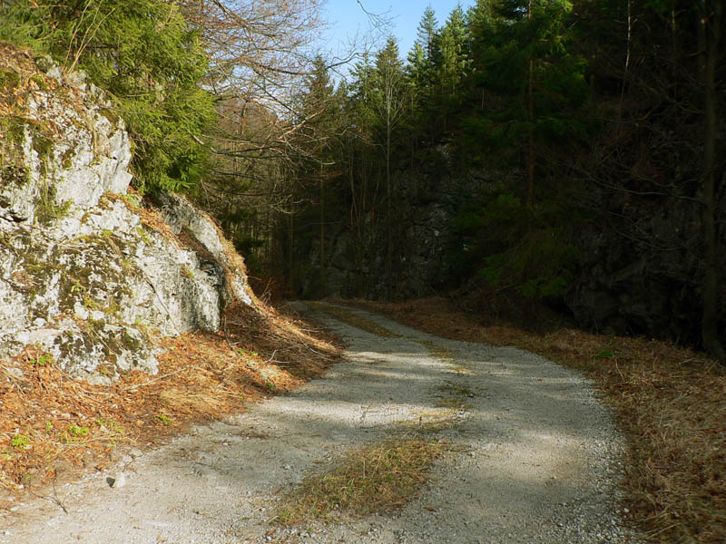 Cesta, o ktorej je reč, sa od hlavnej odpája kúsok nad železničnou stanicou Harmanec – jaskyňa (nejakých 600m n.m.) a dva kúsky od parkoviska pri jaskyni. Najprv sa chvíľu mierne vlní dolinou po vynovenom asfalte (pozor na brešúcich achilovkárov, strážiacich lesnícke kone), naberá sklon, míňa rezerváciu Harmanecká tisina, najdlhší železničný tunel u nás, skalné bralá vpravo, vľavo, prosto je čo obzerať. Za podjazdom medzi tunelmi sa mení na šotolinovú a opúšťa zelenú značku prudkou zákrutou doľava. Tu je to asi najkrajšie, o chvíľu aj najužšie pomedzi bralá a trochu strmšie. Pozor na „autoturistov“ – je to zároveň prístupová trasa k horskému hotelu Kráľova studňa. O kus vyššie na križovatke so Zalámanou dolinou treba prehodiť bajk cez rampu, nasleduje pár stoviek strmých metrov, ďalší malý kaňon a dolina sa otvára, sklon sa zmierňuje. Tu už ťažia (a hlavne zvážajú) drevo, podľa toho cesta miestami vyzerá. Vľavo nad hlavou hučia autá, vpredu v diaľke vidieť senník a vysoko nad ním v záreze ďalšiu cestu na Kráľovu studňu, tentoraz tú zo sedla. Za senníkom sa cesta skrúca doľava do bukového lesa a niekoľkými strmými serpentínami stúpa do sedla. Že sa blíži parkovisko je jasné, hádajte podľa čoho :-(