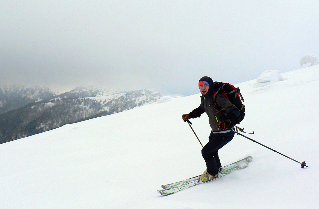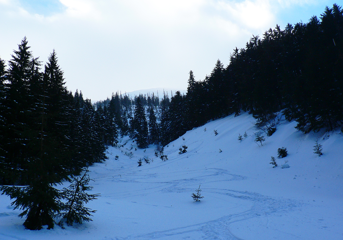 A tak zase krížom cez sochársky ateliér, z druhej strany vidíme zas iné postavičky, len v tej sivote sa to aj zle fotí (ale motohodiny sa točia). Vietor neustal, mraky ostali. Z hrebeňa trošku vidno smer Horehronie v úzkom priezore, ale to je tak všetko tým smerom. Na západ vidno Zvolen, Ploskú aj Smrekovicu, je tam o dačo menej oblakov. Ale inak naša motačka = čistá deka. Od Veľkej hole na sever vidíme pekný kotol na zjazd, inou ako výstupovou trasou, a tak to riskneme, veď isto to dôjde niekde k ceste nad dedinou a auto si nájdeme. V žľabe najlepšia lyžovačka dňa, sneh parádny, hore jemná ale nosná doska a po prvých stromoch aj hlboký (25 cm), sadnutejší, ale stále nelepivý sneh. Pristrmuje sa to aj zužuje, treba opatrne, ale s radosťou. Na spodku ešte chvíľu premýšľame, či si to nevyšliapať znova... Ale je to také strmé na pohľad, že cikcaky sa nám nechce ťahať a napriamo napešo to by bola morda nad kolená. Unavení sme už, tak to necháme tak a po doline preskakujúc potok ideme po stopách miestnych predchodcov.