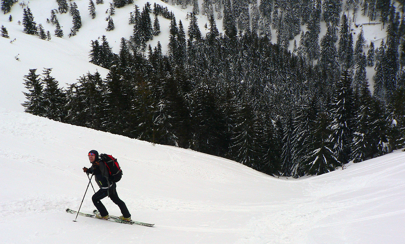 Napešo precupitáme cez dedinu a za apartmánmi u značky dáme lyže a po oficiálnej skialp trase AB sa vnárame do lesa. V lese už mokrý sneh, ale aspoň dobre drží. Horšie je potom v traverze, tam to šmýka na ľavú nohu. Stopa takmer žiadna, tak sme kúsok menisky precvičili. Po chvíli aj tu slnko mizne vo vyššej oblačnosti, no nemáme dnes šťastie. Béčkom smer do sedla Prípor a po hrebeni SNPčky smer na Zvolen. Pri posledných stromkoch po zemi vidím rozvláčené pierka pruhované... Ej dakto tu asi skončil na večeru. Po hrebeni zas prievanovo, výhľady na Nízke Tatry také urezané, vršky nevidno, len tie spodky s V-čkami od lesníkov.