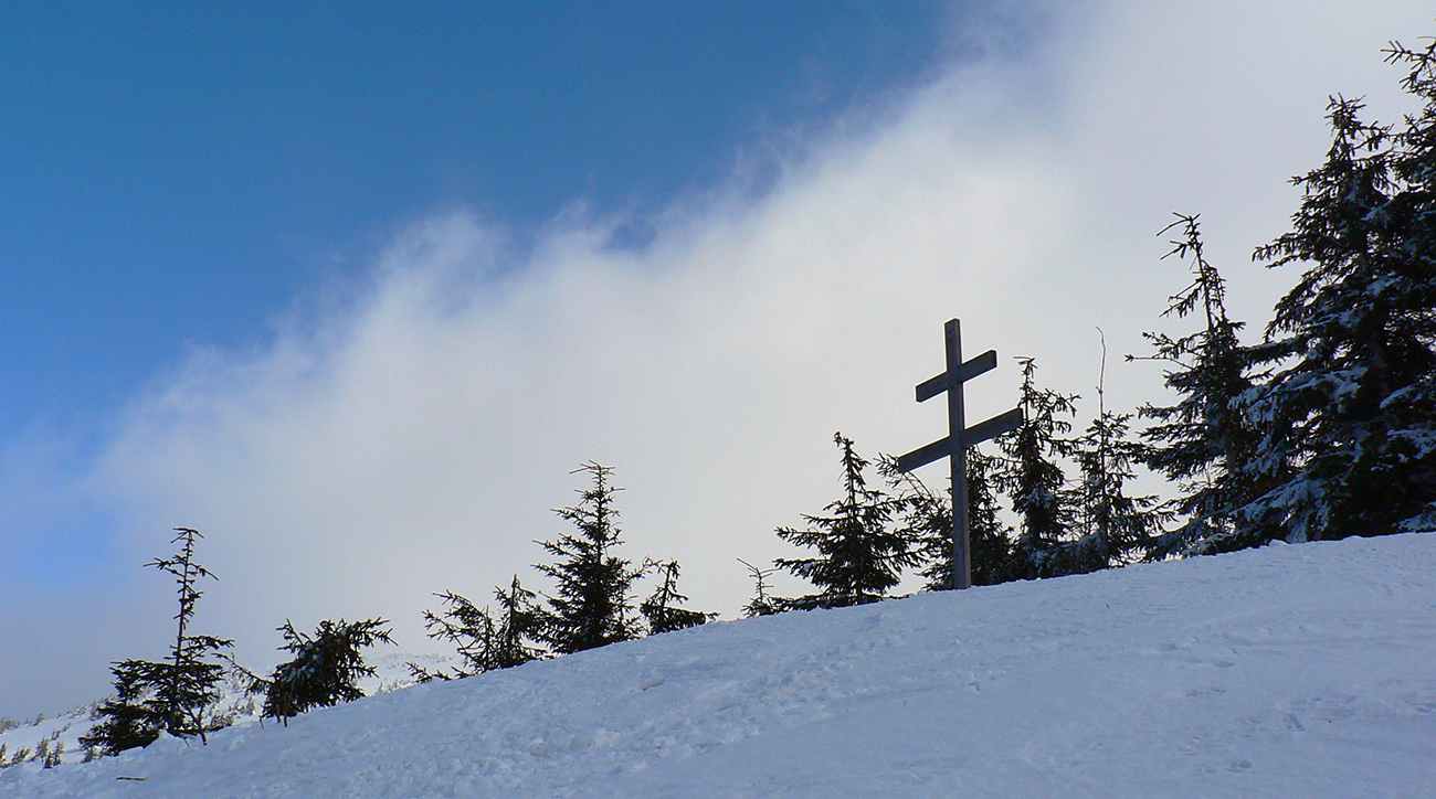 Prvé metre sú slalom v stromoch, ale sneh ozaj dobrý a hlbší, potom sa to otvorí, lebo vyrúbaný úsek. A tam už pekne v rýchlosti a strmosti, pekne točíme. Na dohľad máme dokonca slnko. No to lebo klesáme na ten správny smer. Na slnku v bezvetrí dáme desiatu, debatujeme, fotíme. Výhľad na Prašivú je majestátny, má aspoň o 500 m vyšší profil, vlnový mrak presne kopíruje jej tvar. Dnes asi máme počasovú smolu. Lyže sa vytápajú za tri minúty a stojíme na odmäku. Pošteklíme voskom pásy, nech hore neťaháme tony, a ideme nazad rovnakou cestou. Ale teda dole sa to nezdalo také strmé ako smerom hore. Aj opierku sme si pridvihli a furt strmo, na lyžiach potom kilo snehu zhora. A tak pomaličky až okolo kríža nazad na hrebeň do Sivého Fukarova.