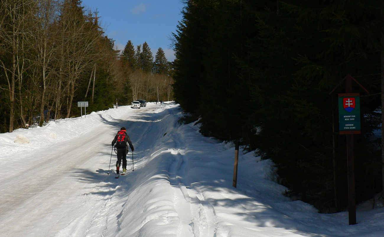 Ako obvykle u vážnych vecí fyziohodzinky idú rýchlejšie a tak 10 minút pred budíkom som už hore. Jeden jogurt a káva, obliecť a vyraziť. Cesty prázdne, pokojne sa šiniem dolnou zemou, neskôr u hlinikárne obzerám hru oblakov s oranžom vychádzajúceho slnka. Na Donovaloch jemne šmýka vyhladený ľad v koľajach, ale posypané je fajn. O pol ôsmej v Liptovskej Osade nasadá Rišo a do Liptovskej Lúžnej už švitoríme spolu. Ponad dedinu ešte zatiahneme kúsok po zasneženej ceste a zapichneme to tam, kde začínajú lyžiarske stopy vo veľkom pribúdať.