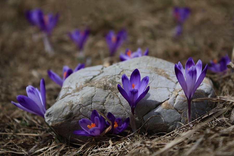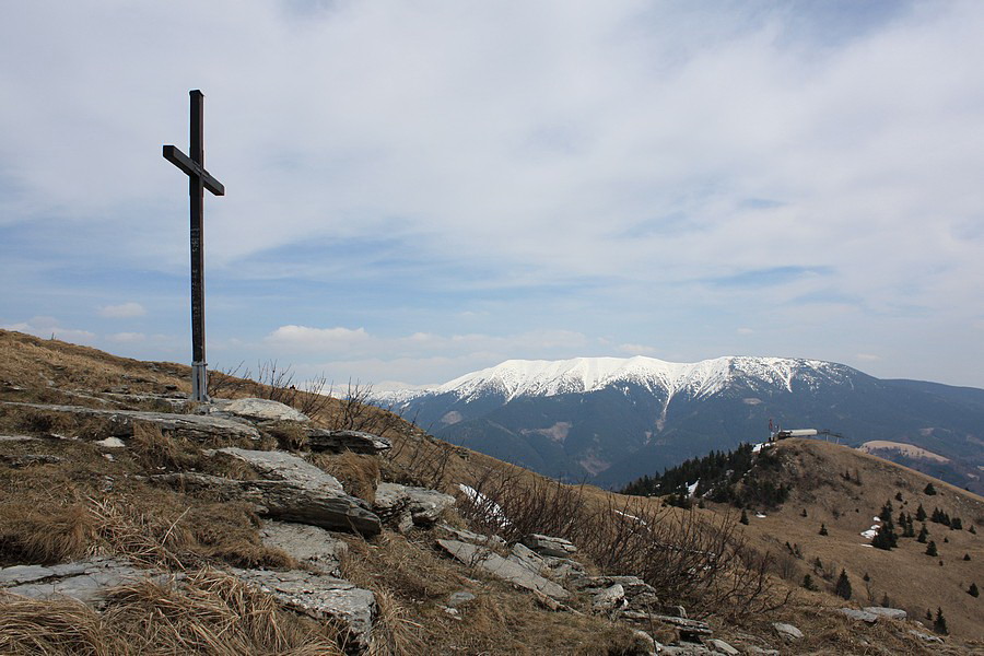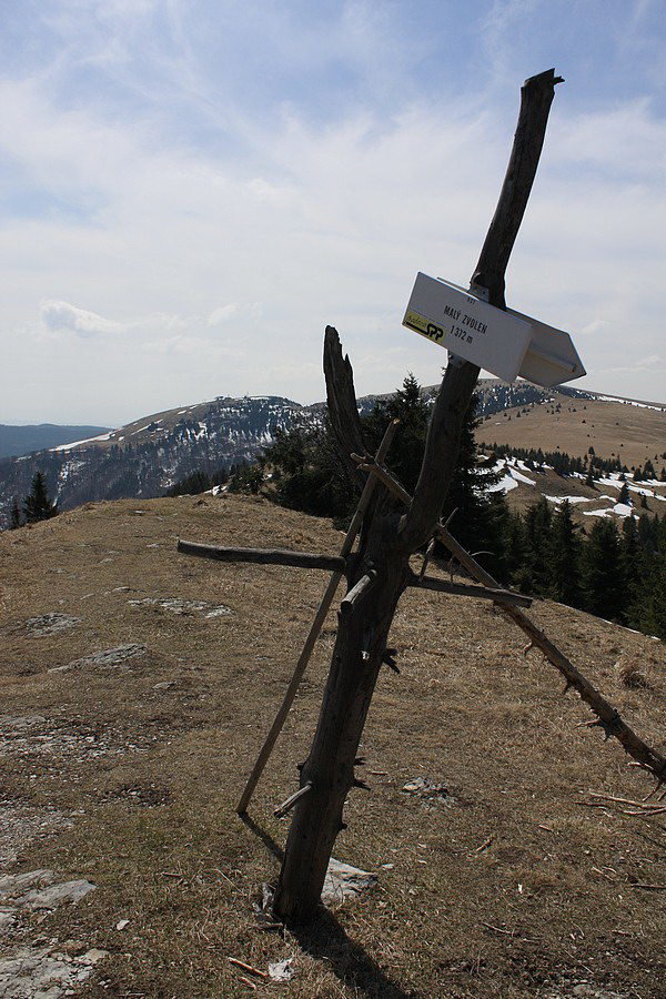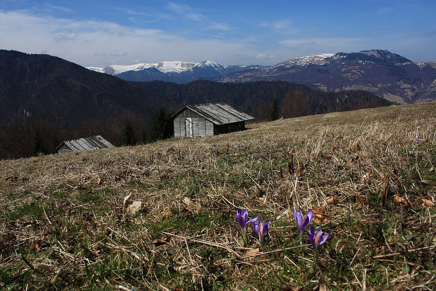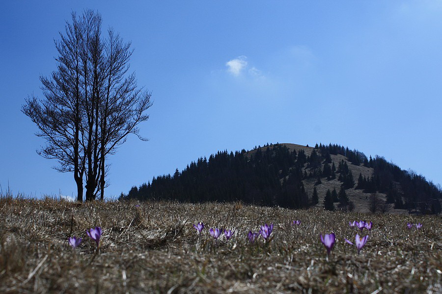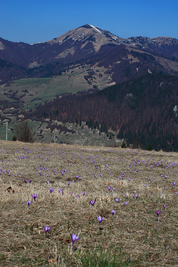 Autobus ma vypľúva na zastávke v Nižnej Revúcej. Viem, že ma čaká niečo cez 800 metrov prevýšenia a skúmajúc zvyšné vystupujúce osadenstvo mi je jasné, že si okrem zvýšenej tepovej frekvencie užijem aj ticho a samotu. Vykročím svižne po žltej značke. To tempo ma však veľmi rýchlo prejde, keď po pár desiatkach metrov chodník prudko odbočí pomedzi domy. Šinie si to priamo k lyžiarskym vlekom a hybaj ho hore zjazdovkou. Odmenou za vypľuté pľúca sú ale krásne výhľady na veľkofatranský hrebeň od Rakytova cez Čierny kameň až po Krížnu. Aj v tomto ročnom období zjazdovka žije svojím životom. Všade sú milióny fialových kvietkov - asi to bude šafran :o) Na vrchole zjazdovky ticho vďačím za chabý tieň medzi konármi stromov. V letných horúčavách by ma na túto trasu nikto nenahovoril. Takmer celá vedie lúčinatým a hôľnym terénom. Slušný predpoklad na uvarenie mozgu natvrdo. Na Malý Zvolen je to už čo by kameňom dohodil. Trochu pomedzi stromy a cez osirelé snehové políčka (ktoré sa drzo tlačia do topánok), trochu trávnatým hrebienkom a som hore. Neviem, či mám najskôr fotiť kruhové výhľady alebo kvetinky. Z fototranzu ma preberie iba bodľačina, do ktorej si nevedomky líham. Ešte zbodnem sváču a vyrážam ďalej.