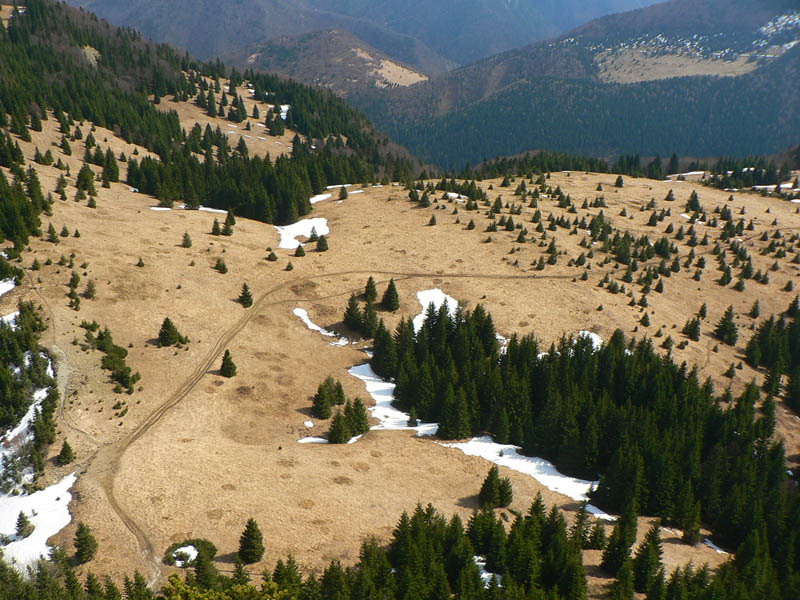 Samozrejme že napriek tomu vidieť vo svahu ľudí. Vraciame sa k nižšiemu rázcestiu (smerovník pod Rozsutcom) a pokračujeme po modrej, traverzom východného svahu Veľkého Rozsutca do sedla Medzirozsutce. Chodník vedie najprv pasienkami (parádne výhľady na východ), v druhej polovici lesom. Miestami je ešte nepríjemný ľad, poskrývaný pod hrubými nánosmi bukového lístia. Tesne pred vynorením z lesa na Medzirozsutcoch trčia vo svahu zaujímavé skalky a z nich je pekný pohľad na sedlo aj Malý Rozsutec. Na ten je výstup povolený, takže neváhame a o polhodinku už si vychutnávame kruhový výhľad z vrcholu. Spestrením je v oboch smeroch exponovaná skalná pasáž, zaistená reťazami, ale teraz v predjarí aj ľad v lese.