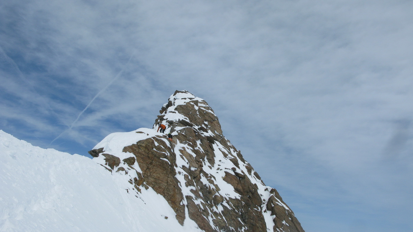 Pod vrcholovým hrebienkom sme boli v čase pod šesť hodín výstupu. Tu sme nechali lyže, obuli mačky a čakali na nás posledné metre exponovaného lezenia mixovým hrebienkom.