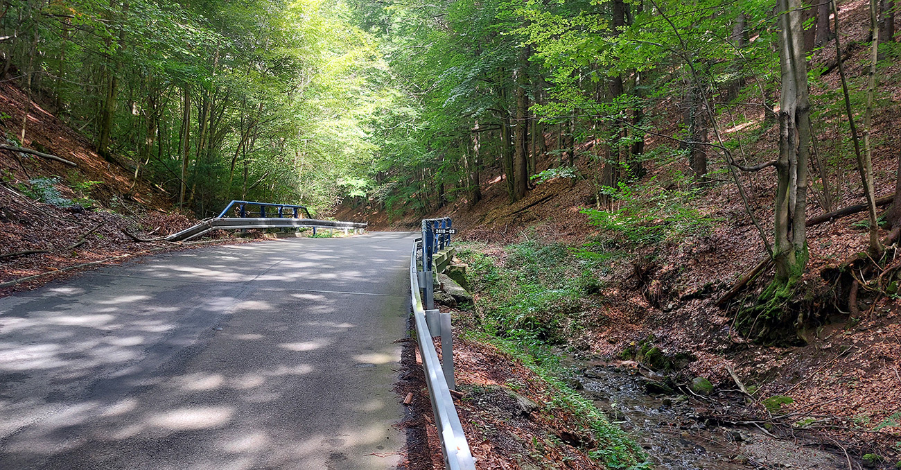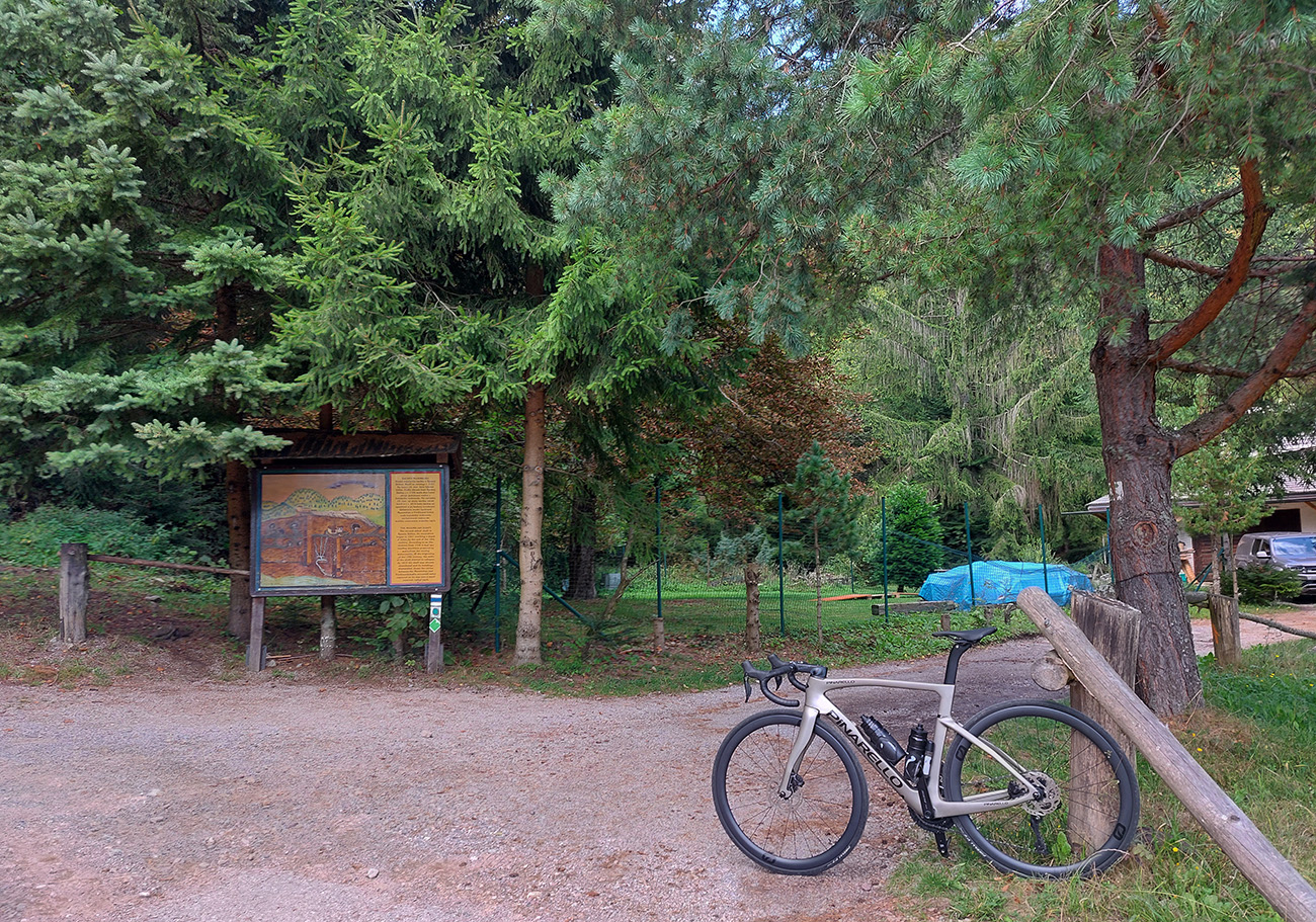Tento živý banský skanzen blízko Banskej Bystrice je všeobecne známy, aj tu na Vetromagu sme sa oň už párkrát obtreli (odkazy dolu), ale vždy na tlstých gumách. No samozrejme, že tam vedie aj asfaltová cesta a už pár rokov je na nej dokonca aj žiletkársky komfortný povrch, tak nesmie tento cieľ chýbať ani v „žiletkárskej“ sekcii. Cesta je dosť široká, aj dva autobusy by sa obišli, jeden bezpečne obíde aj cyklistu. Výhodou/nevýhodou (podľa počasia a ročného obdobia) je poloha v tienistom lese, slnko na cestu zasvieti len popoludní, priamo od západu, juhozápadu. Aj to len ostrovčekovito, koľko koruny stromov dovolia. Stúpanie to nie je dlhé, po námestie necelé štyri kiláky, zato slušne výživné (8-10%). Kto si ho však chce naplno užiť, odbočí na námestí doľava a čaká ho ešte slušnejšia (priam vražedná, 20-percentná) gradácia pomedzi chalupy na záverečných 500 metroch. To je základný a najdlhší variant, s dobrým asfaltom až po jeho koniec. Z námestia sa ale dá pokračovať aj rovno – je to rovnako dlhé, len miernejšie a asfalt je tam podstatne horší. Celé aj so zjazdom nazad dole do Uľanky to potom vyzerá takto: