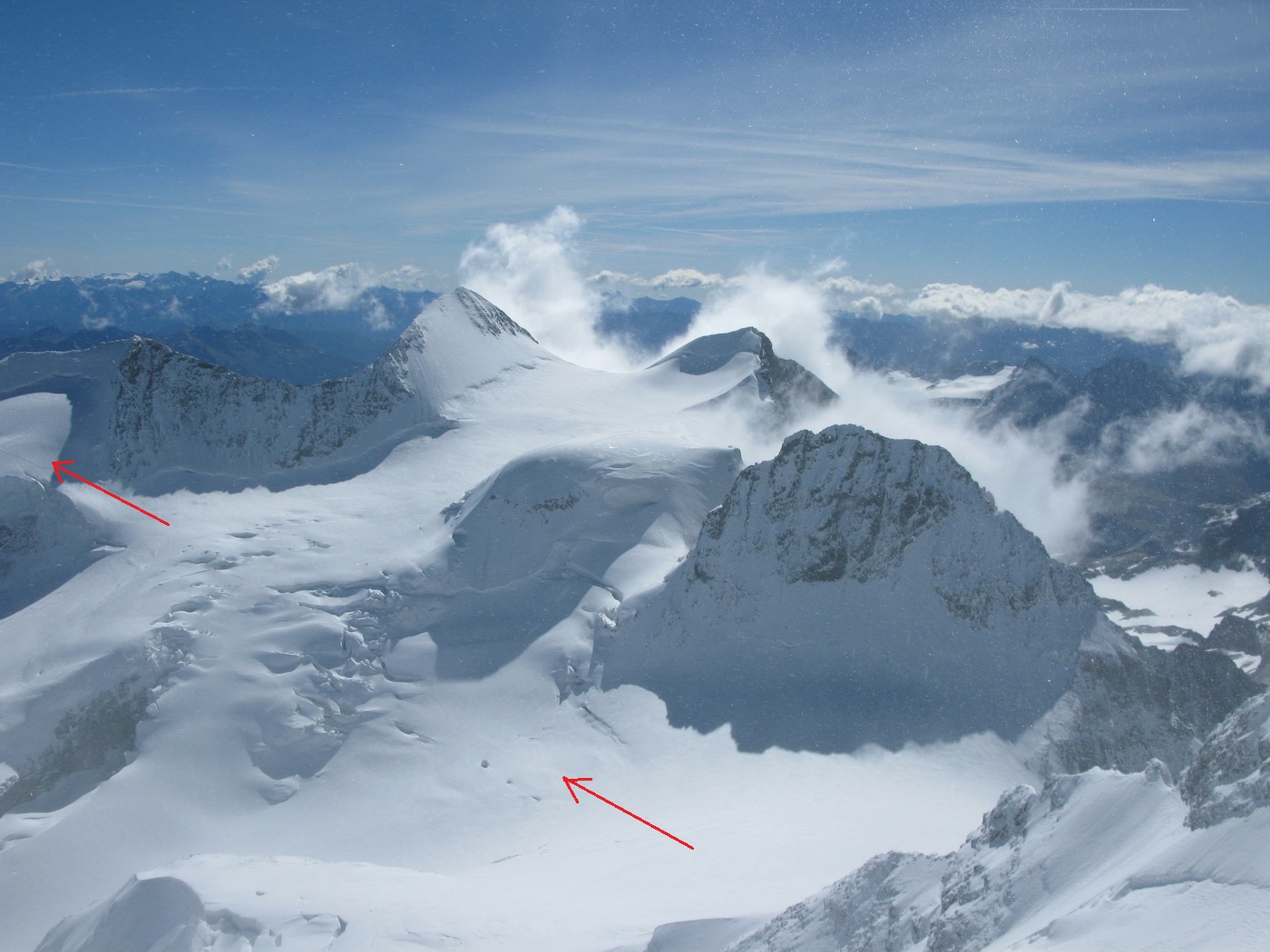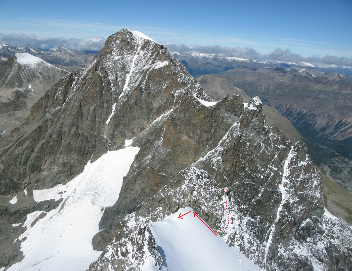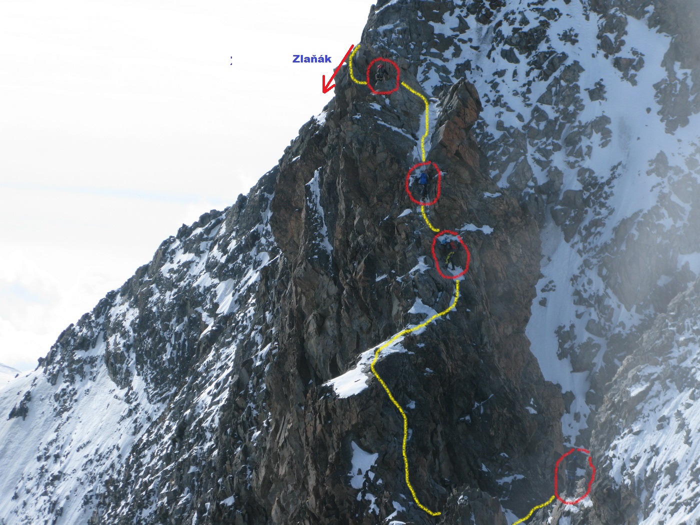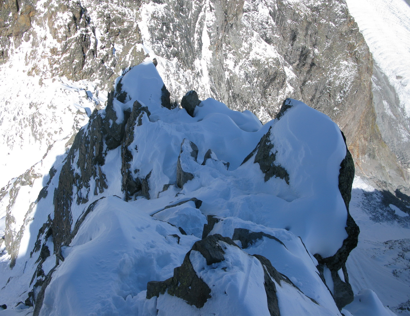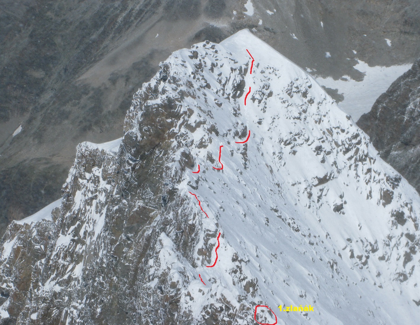 Najrýchlejšia a najpoužívanejšia trasa odbočuje v hornej časti zo skalného hrebeňa vľavo a mierne klesajúcou exponovanou rampou vás privedie na strmý ľadovec (foto). Preistený je aj variant až na koniec skalného hrebeňa, končiaci krátkym zlaňákom. Ten je však určite dlhší. Stretol som tam horských vodcov, ktorí ho akurát zaisťovali s tým, že klientov na ľadovci istiť dobre nemôžu na rozdiel od skalného hrebeňa.