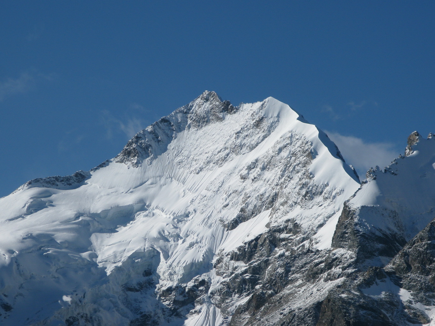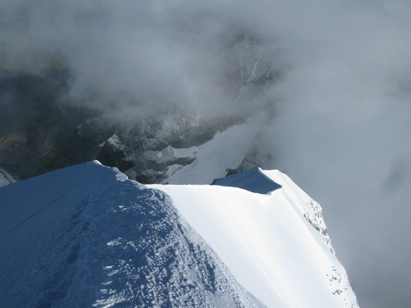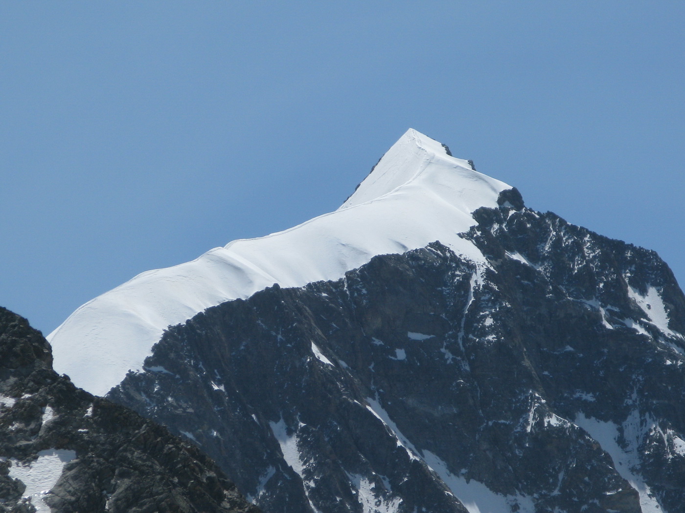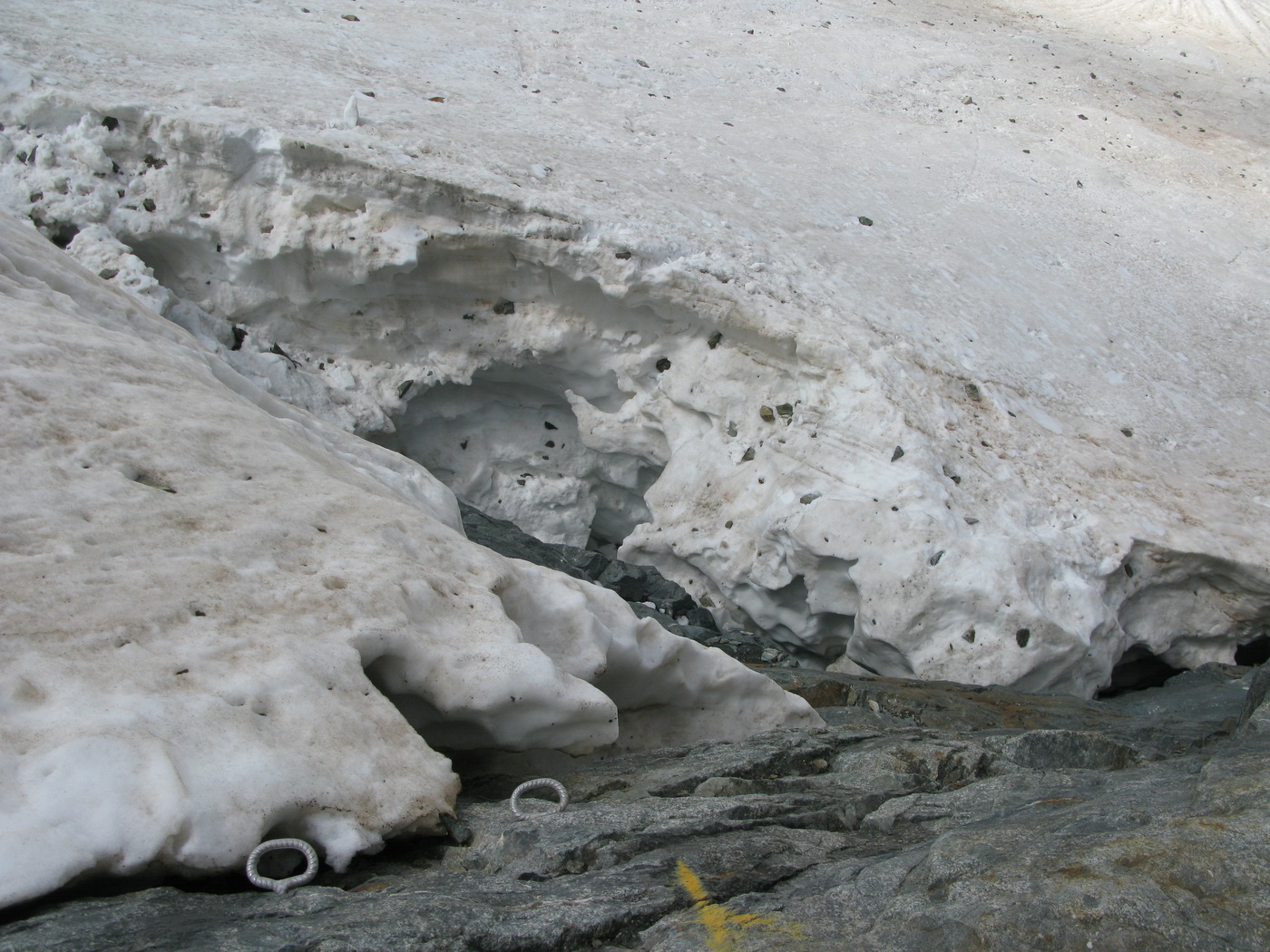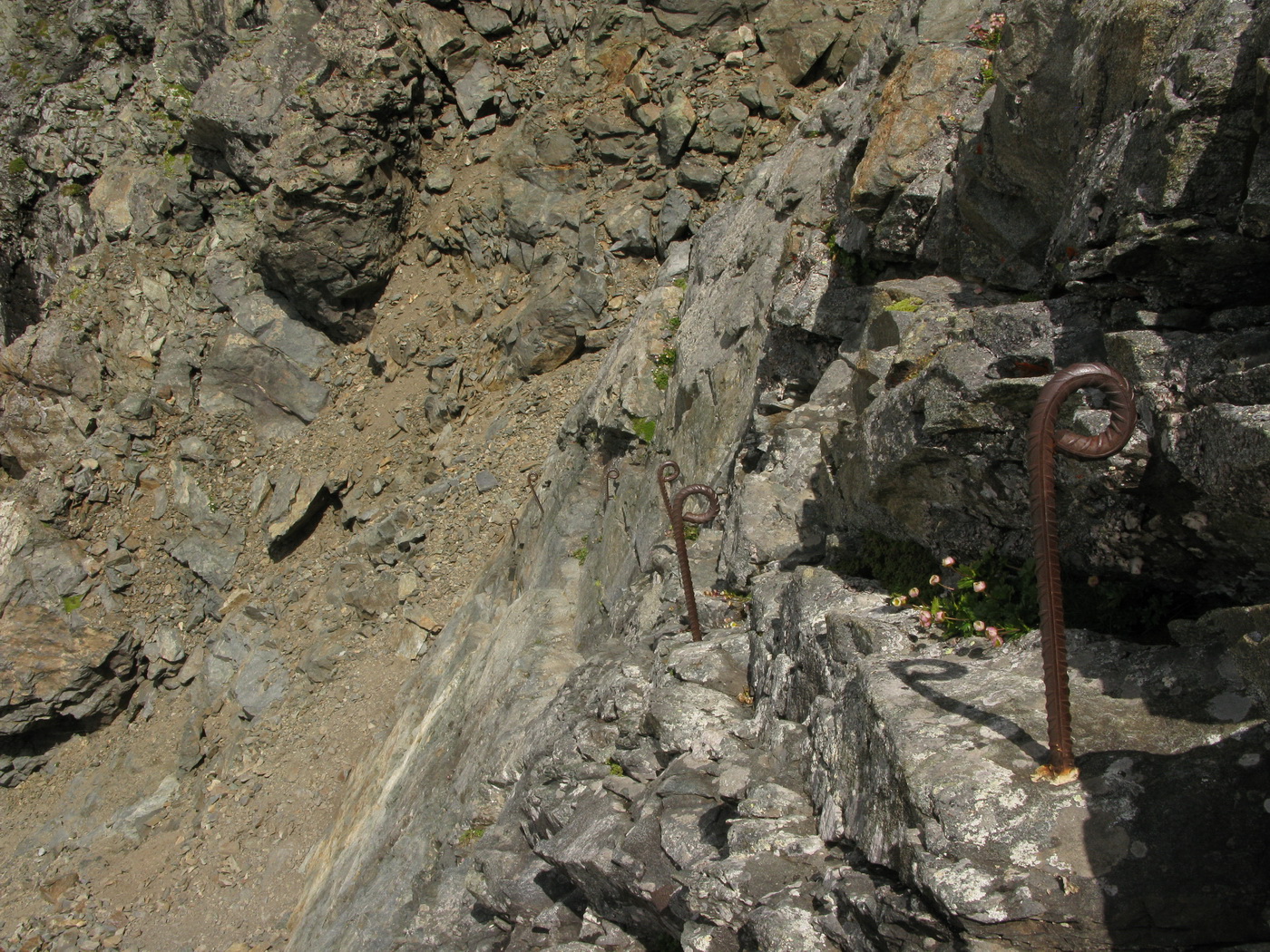 Najrýchlejšia a najpoužívanejšia trasa odbočuje v hornej časti zo skalného hrebeňa vľavo a mierne klesajúcou exponovanou rampou vás privedie na strmý ľadovec (foto). Preistený je aj variant až na koniec skalného hrebeňa, končiaci krátkym zlaňákom. Ten je však určite dlhší. Stretol som tam horských vodcov, ktorí ho akurát zaisťovali s tým, že klientov na ľadovci istiť dobre nemôžu na rozdiel od skalného hrebeňa.
