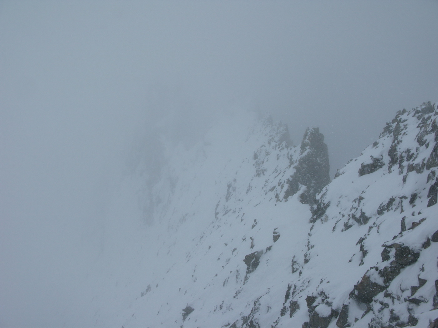 Prichádzam ku hrebeňu, je to stále ťažšie traverzovať ho v týchto podmienkach. Kúsok po hrebeni idem štvornožky. Tu mi boli mačky aj čakany nanič. Pri pohľade vpravo mi nie je moc dobre. Ľavá strana je na tom len o kúsok lepšie.