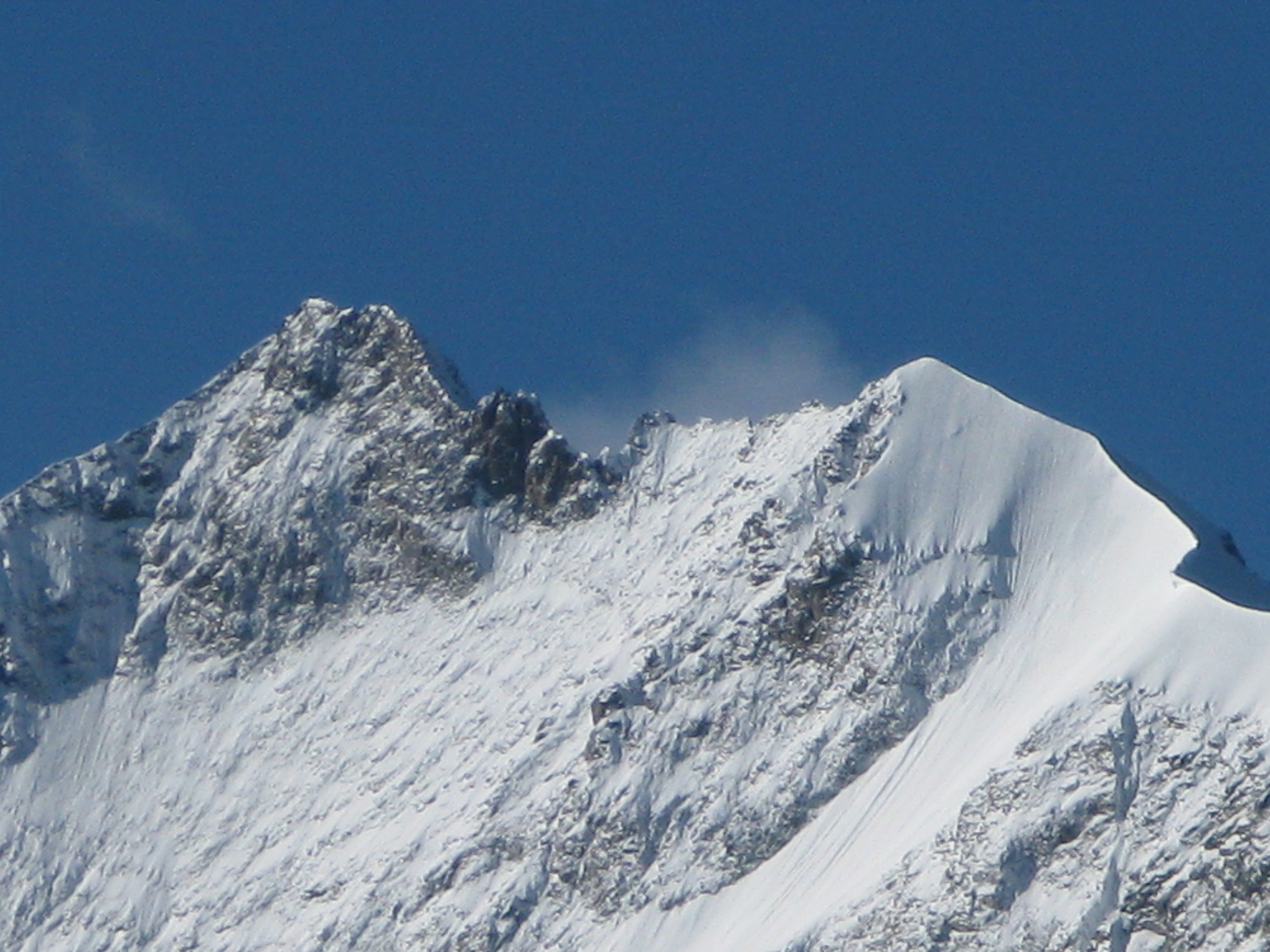 Vychádzam na Piz Bianco (3995m). Mraky sa roztrhali a postupne miznú. Vietor však neustáva.