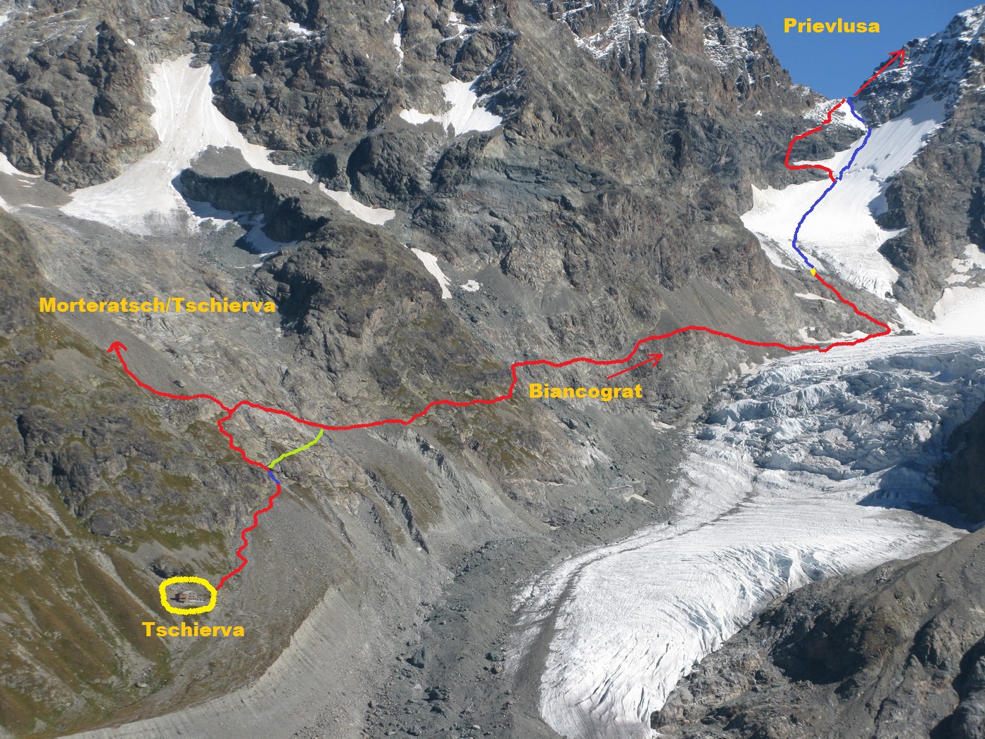 Toľko normálka. Na Berninu však vedie ešte jeden veľmi často používaný výstup: Biancograt. Aj keď sa tu už nedá hovoriť o normálke a obtiažnosťou je tento výstup už skôr horolezectvom ako VHT je veľmi obľúbený a každoročne sa o neho pokúša množstvo ľudí. Moje prvé leto v Engadine som strávil nad týmto problémom zopár dní a výsledkom je tento článok. Rozdelil som ho na dve časti: Prvá bude akýmsi praktickým sprievodcom a druhá bude reportom zo samotného, konečne úspešného pokusu.