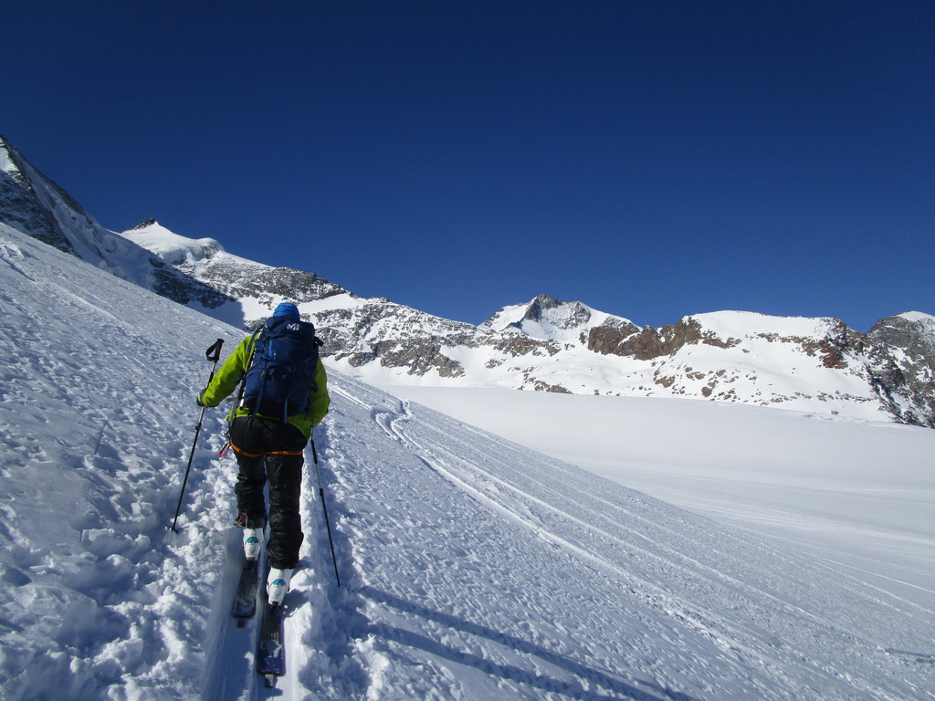 Lyžujeme dole na ľadovec svahom vľavo popod Piz Trovat. Tam už sa chystajú na výstup prvé skupinky. Túra na Piz Palú je veľmi populárna aj napriek tomu že vedie cez nepríjemný ľadovec.