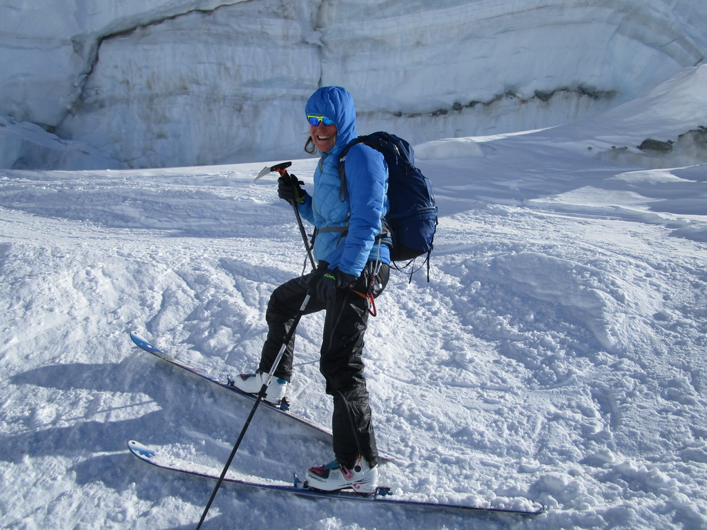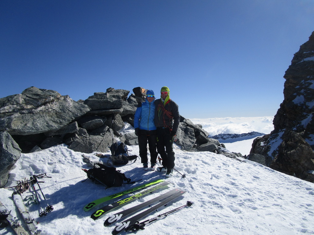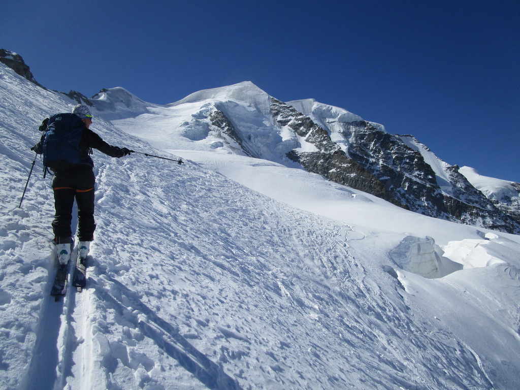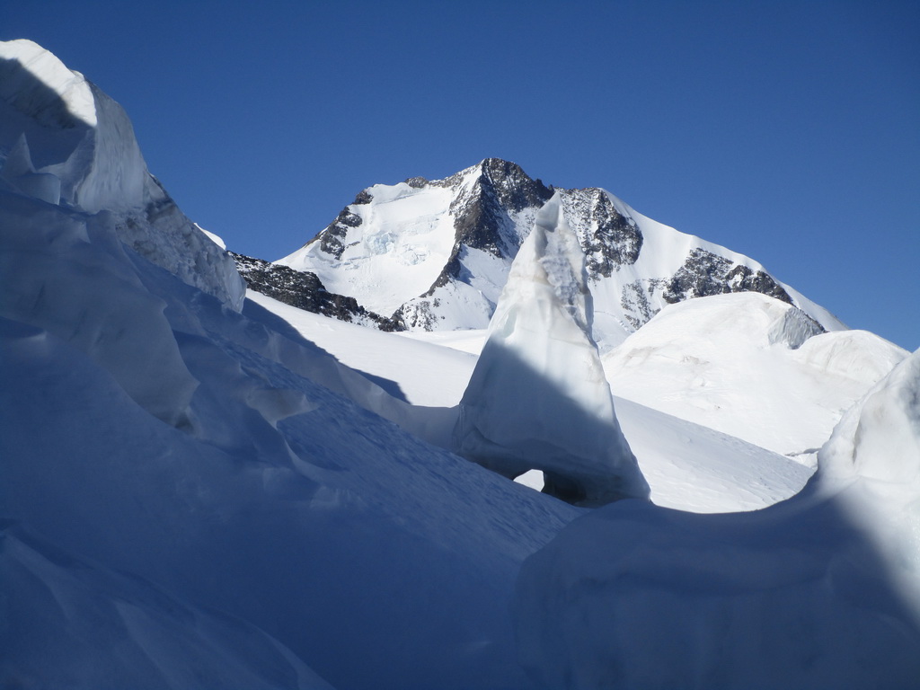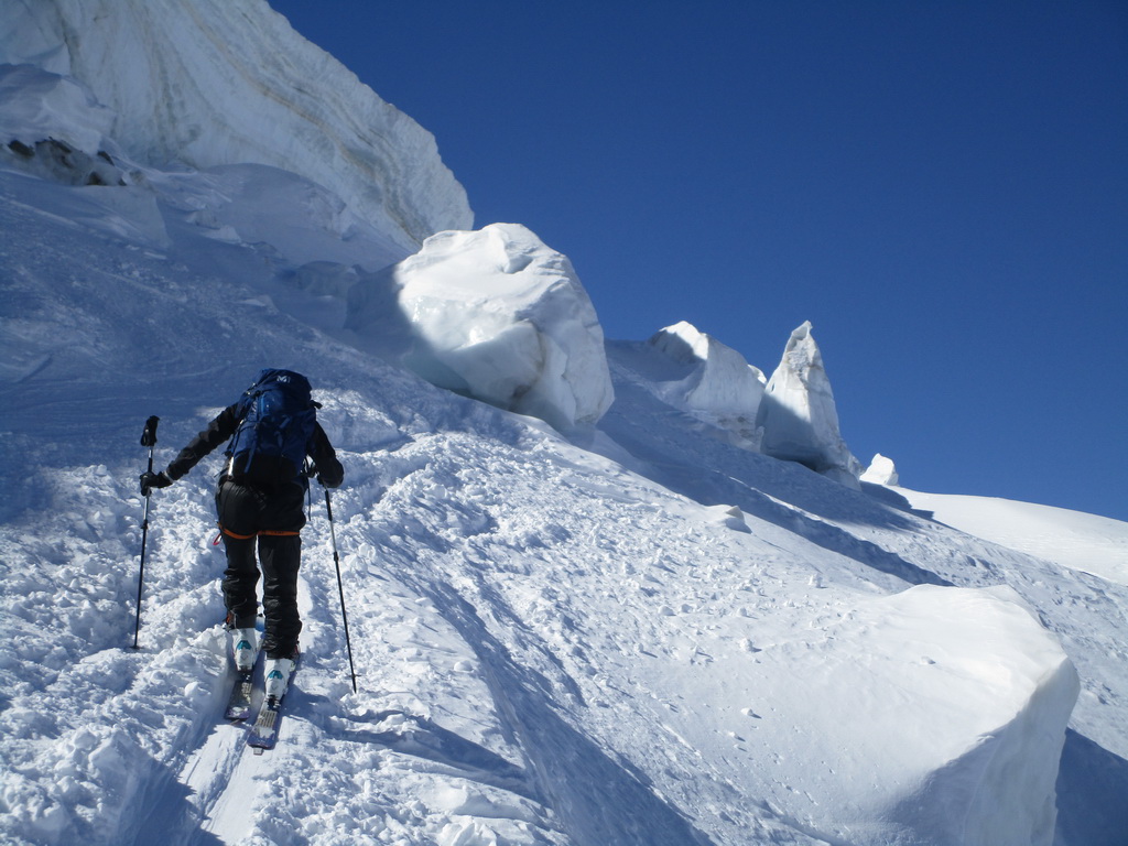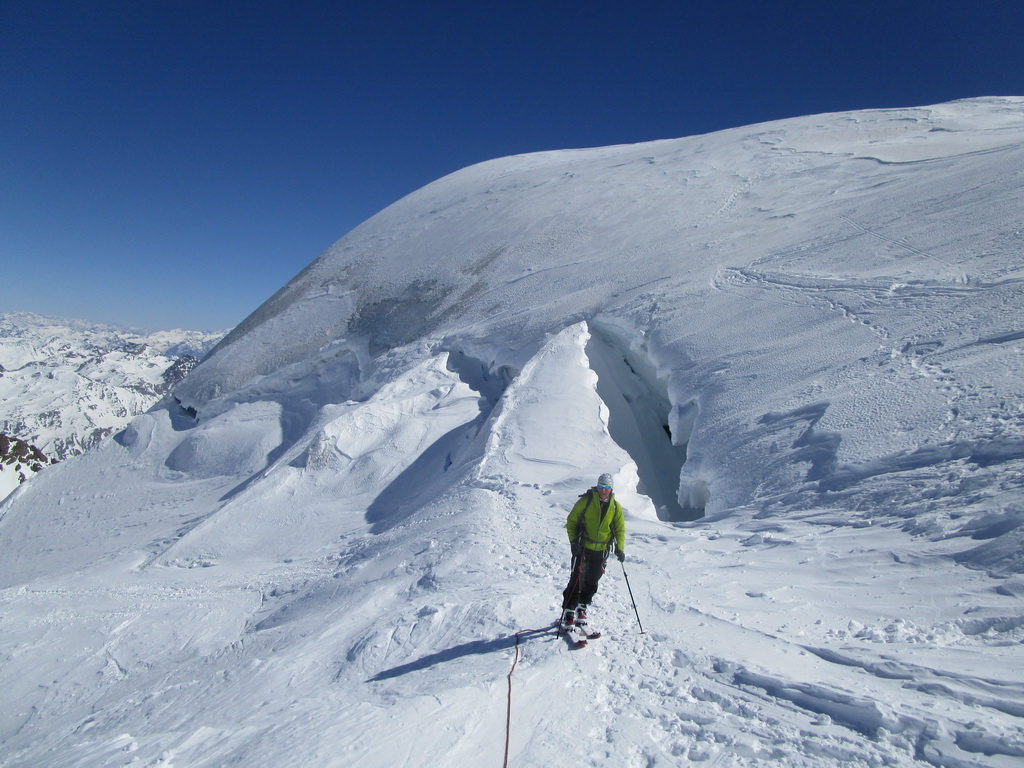 Ďalej ideme opäť na lyžiach. Klučkujeme medzi trhlinami ktoré sa rysujú pod snehom. Prichádzame do sedla pod vrcholom. Ten je celý ľadový iba na hrebeni je nalepený sneh po ktorom sú vyšlapané stopy.