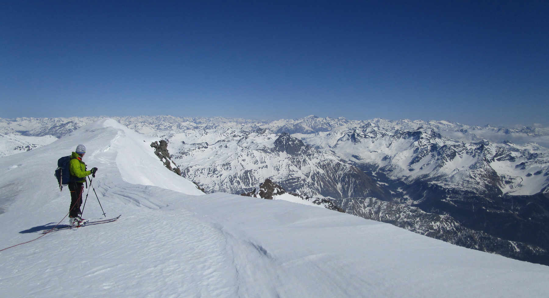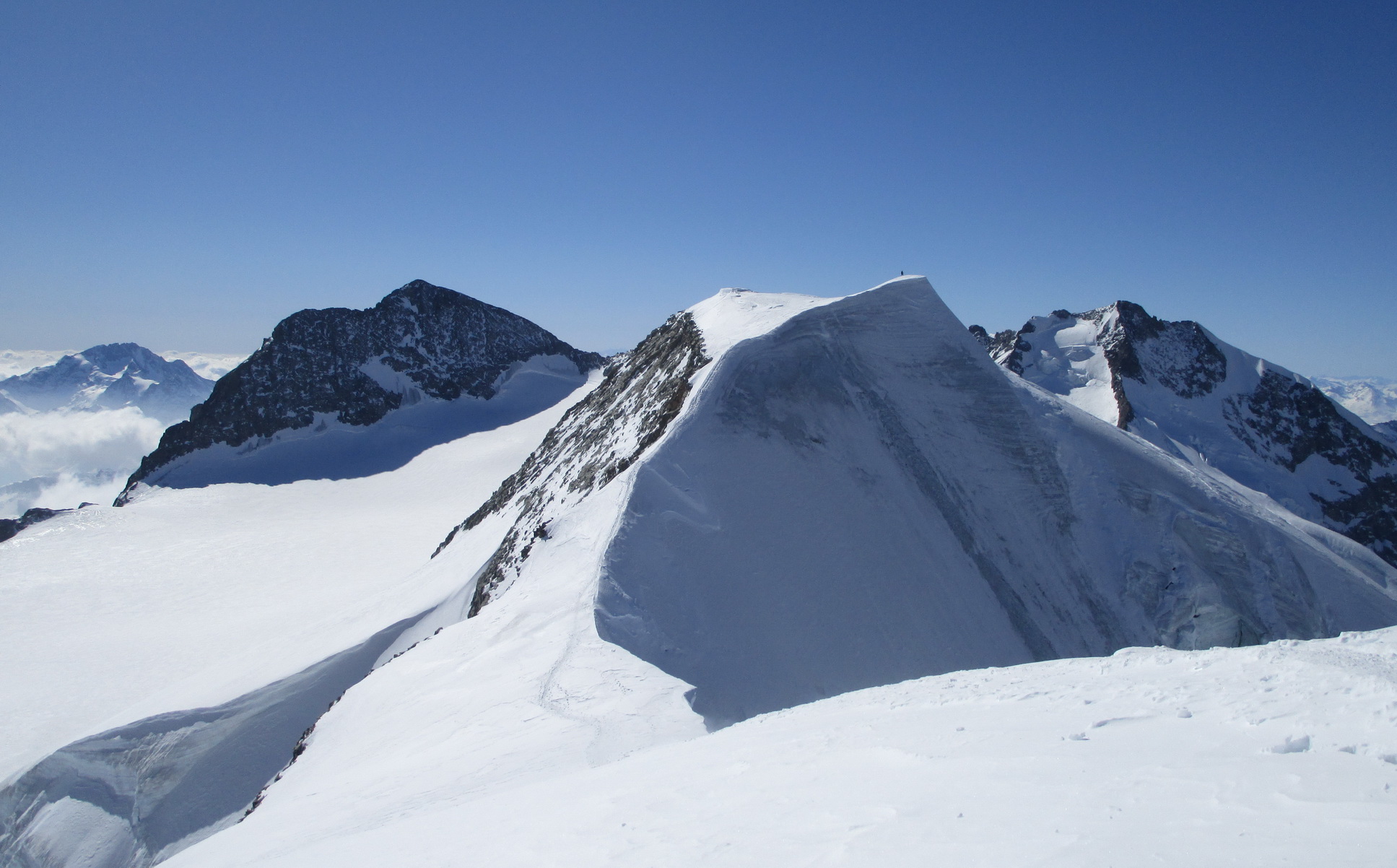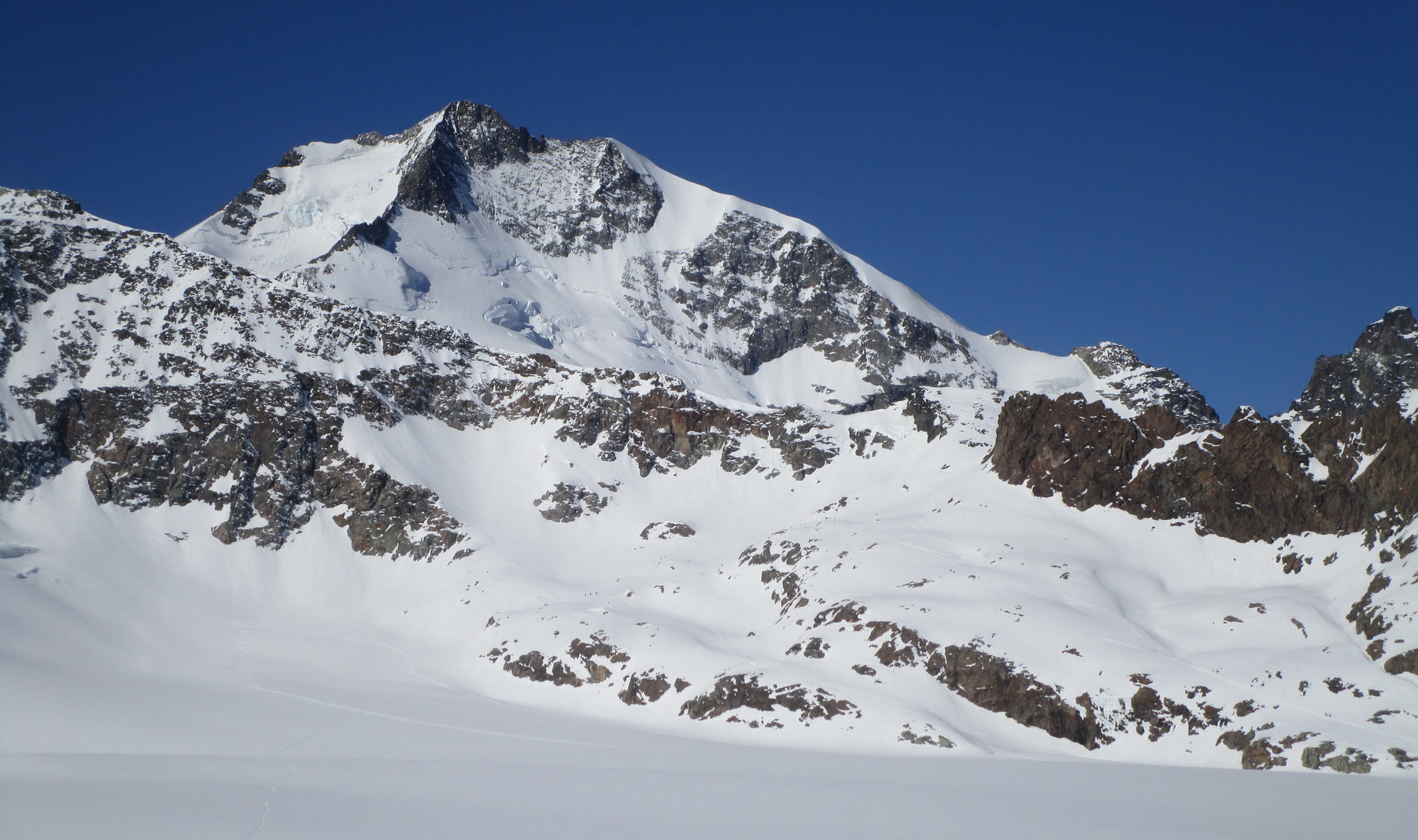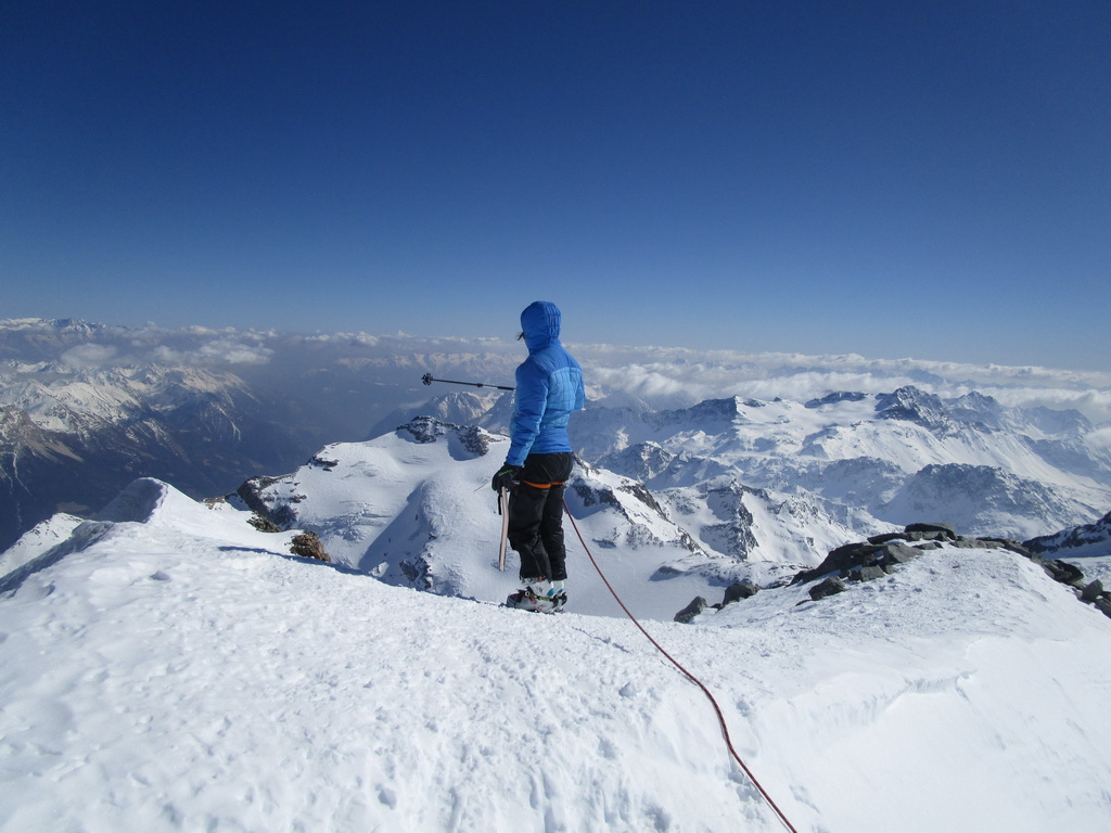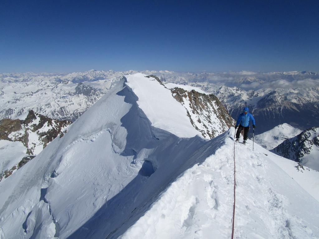 Ďalej ideme opäť na lyžiach. Klučkujeme medzi trhlinami ktoré sa rysujú pod snehom. Prichádzame do sedla pod vrcholom. Ten je celý ľadový iba na hrebeni je nalepený sneh po ktorom sú vyšlapané stopy.