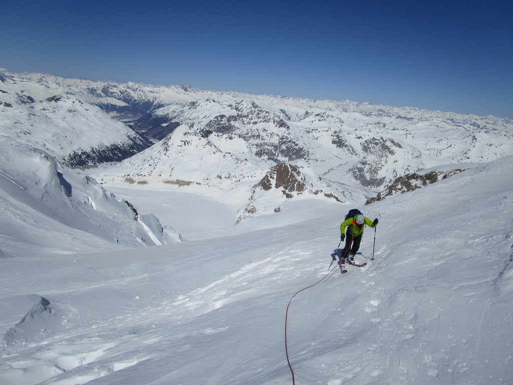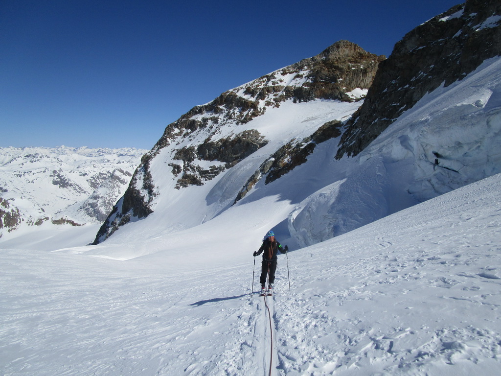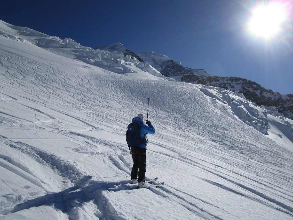 Začíname šlapať nenaviazaní, lano vyťahujeme až po prvom výraznom ľadovcovom zlome, ľadovec doteraz vyzerá mierumilovne. Ľudia šlapú pred i za nami. Zatiaľ sme na problém nenarazili aj keď v ľadovcovom zlome trebalo dať na pár metrov dole lyže. Po prejdení druhého plata sa terén pristrmuje.