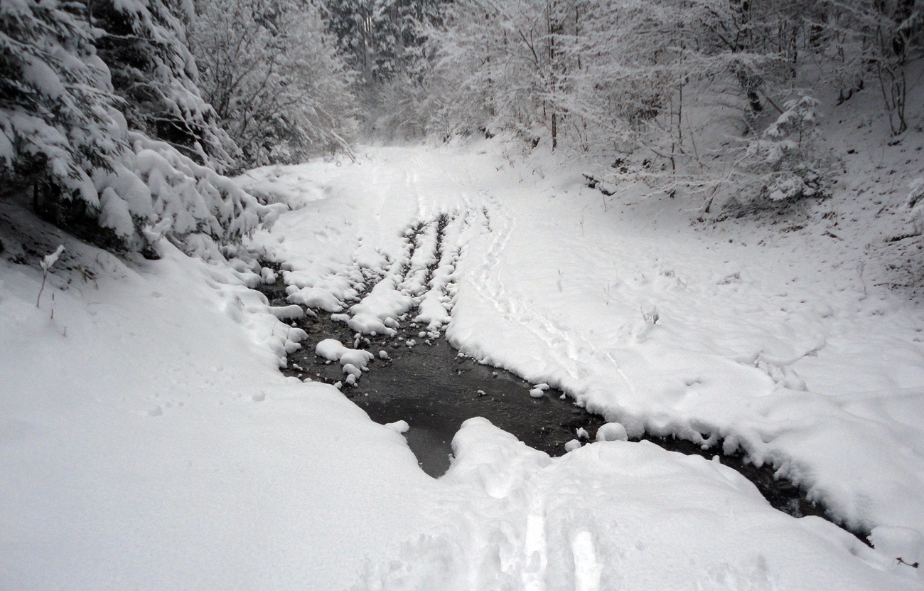 Aj nad Havranovom v lese ešte málo. Cez mostík nad chatou ale idem prvý. Na výšľap to stačí, aj keď spočiatku škrtám o šutre a korene, ale dole by som z Borišova lyžoval najviac ak po zákrutu k potoku. Zato nad ňou je to stále väčší boj so snehom. Rúbanisko aj skratka lesom od kolíb na Košariskách sa veru už pýtajú poorať.