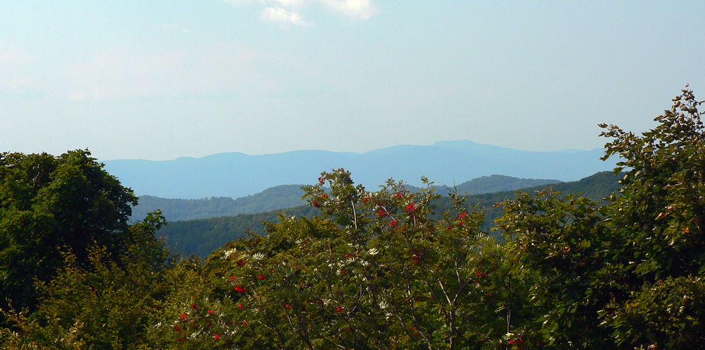 Nižšie v sedle je smerovka k prameňu pod svahom, ale ten je beznádejne suchý. Ten nasledujúci pod Pľašou už ani nejdeme obzrieť. Pľaša je posledný holý vršok s kruhovým výhľadom, potom až na Kruhliak je to prevažne lesom. A klesáme, takže aj keď sa nejaká tá lúka naskytne, stromy už sú vysoké, do diaľok nevidno. Satisfakciou sú černice, ktoré nahrádzajú vyššie rastúce čučoriedky. V dobrom čase sme sem prišli :-)