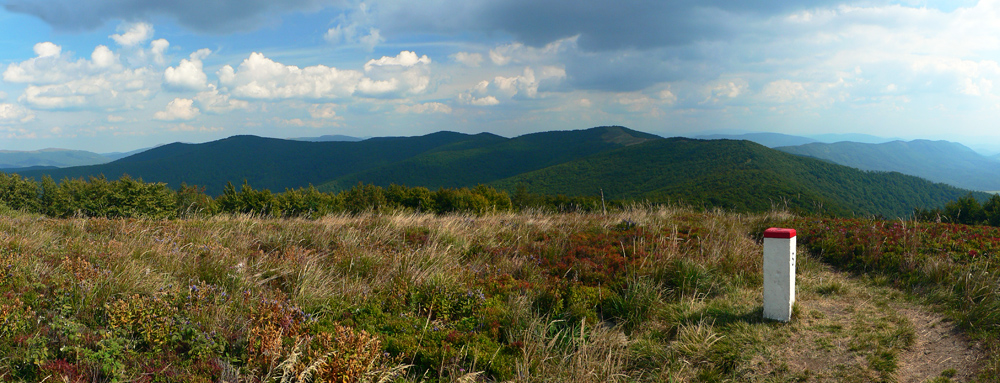 Tam sa najprv pokocháme novou a vyleštenou vyhliadkovou plošinou aj s panoramatickou mapou (na našej strane). Je nad strmým skalným zrázom, ktorý je v tomto „guľatom“ kraji dosť veľká rarita. Na vrcholových čučoriedkových poliach si nejaký chlapík trúfa oberať hrebeňom a podľa vybavenia sem na túru neprišiel - no, možno majú u susedov iné predpisy... Poliakov teraz dosť pribúda (už si to môžu zdola pekne zokruhovať), len sa divíme, že sú skoro všetci totálne naľahko. Niektorí nesú najviac tak mobil a okuliare :-)