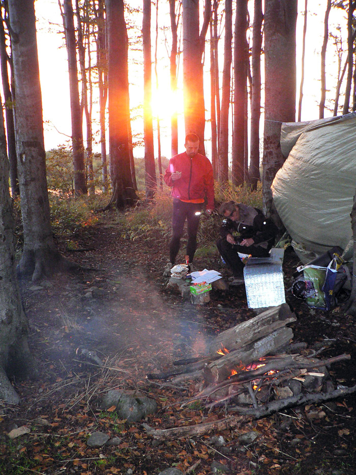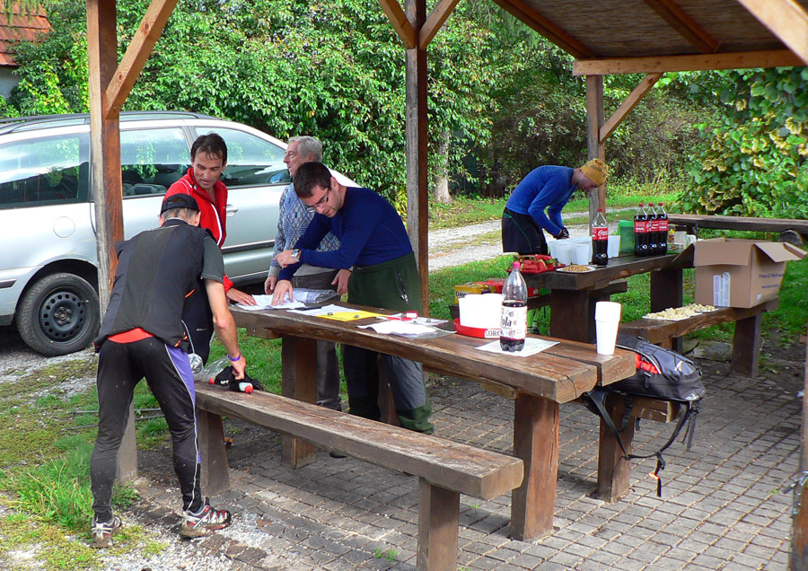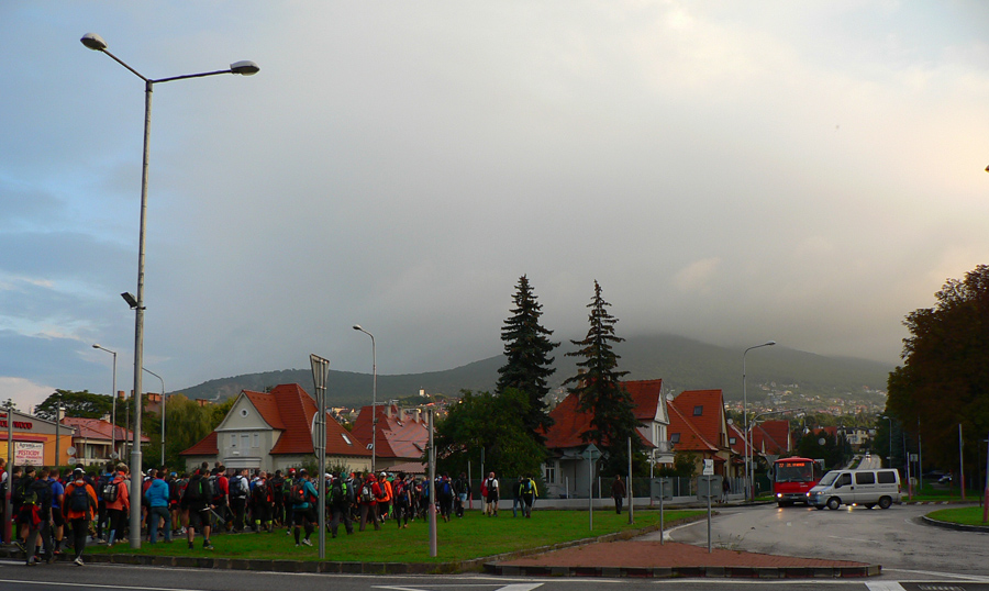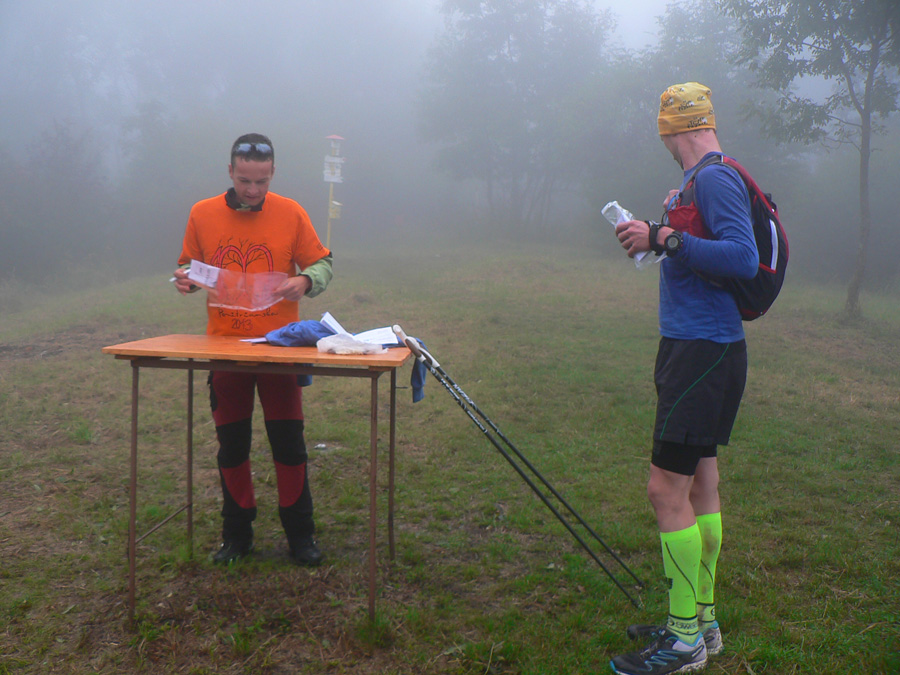 Ale prišla sobota, 21. september, ráno ideálne chladné na "rýchlejšiu turistiku", len trochu vlhkejšie. Mraky sa prevaľovali, sem tam slnko vykuklo. Aj spŕchlo pred štartom a hore na hrebeni keď zafúkalo, z mokrých stromov pršalo druhý raz. V kalendári skoro rovnodennosť, takže kto chcel prísť za vidna (asi do 19:00), musel zlomiť traťový rekord. Takých kandidátov sa na štartovke nazbieralo dosť - minimálne prvé dve dvojice z tohoročnej "nadzvukovej" Stíhačky. A čakalo sa, čo predvedú neznáme zahraničné mená.