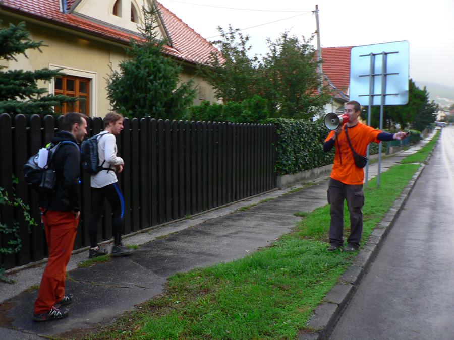 Prezentácia sa trocha natiahla, lebo veľa ľudí si samozrejme prosbu organizátorov (prísť s dostatočným predstihom) neveľmi bralo k srdcu. Ale nič dramatické, len štart bol posunutý na 7:15. Takže po srandovnom presune dvestohlavej masy cez nitriansky kruhák, ktorý bol sprevádzaný vyvalenými očami spoza volantov, hlavný spolupáchateľ Rado pozdvihol megafón a...