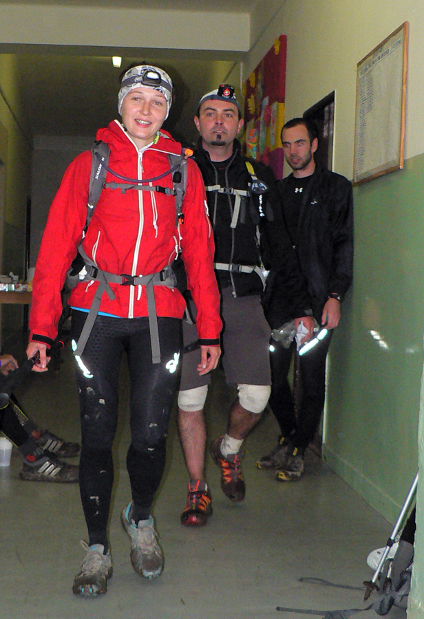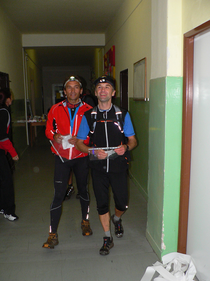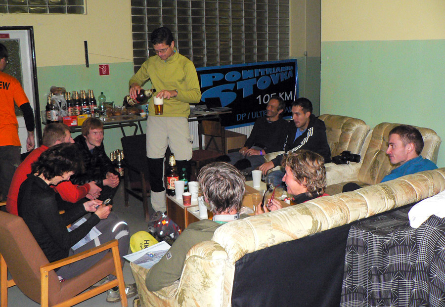 Prvá trojka dorazila do cieľa ešte za vidna a všetci rýchlejšie ako vlaňajší víťaz, aj takéto postupné posúvanie limitov je obraz progresu terénnych ultrabehov v posledných rokoch na Slovensku. Lenže potom hodinová diera a netrpezlivé čakanie, kedy dorazia ďalší, veď už by tu mali byť - lenže dorazili mestskí policajti! A vraj čo blbneme, veď pod Gričom prebieha poľovačka!!! A či organizátori behu nahlásili akciu úradom a také tie policajné oné... Našťastie len trochu planého poplachu, poľovníkom sa hádam podarilo vysvetliť, že diviaky sú síce podobne zaprasené a aj smrdia ako bežci po 100km, ale nemajú čelovky :-) Žiadna zabijácka rojnica v lese sa nekonala, len sa trochu mulatovalo na poľovníckej chate, že?