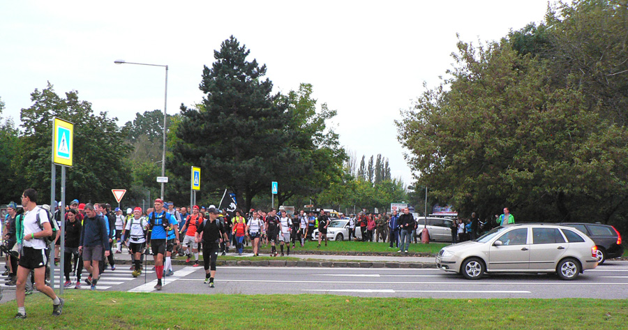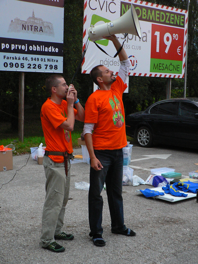 Pred štartom v Nitre: Novinkou bola prezentácia už večer. Dalo sa potom zapísať aj ráno, ale už vlani boli problémy všetko stihnúť. Teraz sa vďaka večernej prezentácii ráno všetko stihlo - zdalo sa, že celkom v pohode. Po parkovisku pobehovali za brieždenia divní panáčikovia s ruksačikmi, len jeden nemenovaný za sebou ťahal lodný kufor :-) Niektorí sa tvárili, že rozklusávajú, pritom ale hľadali čo najhustejší krík. Radov megafón išiel na plný výkon a dvojjazyčne! Chlapec mal tradične sklený pohľad, na pozdrav neodpovedal na prvý raz a potom už ten tlak zodpovednosti nevydržal a chcel sa ísť zastreliť či čo... Ale všetci išli za ním, tak si to rozmyslel, o siedmej strelil len tak do ľuftu a davy sa pohli.