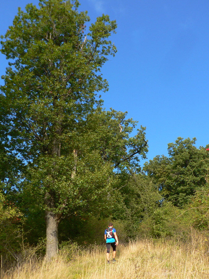 Doteraz sme fičali prevažne v príjemnom tieni lesa. Ale pri strmom stúpaní južným svahom na vrchol, keď sa stromy miestami rozostúpili, osobne som si začal uvedomovať, že dnes to pre nás chladnomilných nebude. Tá obloha podozrivo modrela! A keď mi na zostupe do Zlatna došla voda „v hrbe“ (vlani mi vystačila do Veľkého Poľa!), začal som sa trochu obávať nasledujúceho úseku. Križovania turistickej značky so zvážnicami, ideálne na zablúdenie, Rado a spol. ukážkovo „ofáborkovali“. Po minuloročníkových „kufroch“ som si už väčší pozor dával, aj preto že som zle odbočil už vyššie. Na odbočku z asfaltky do Zlatna už sme si už dávali dobrý pozor presne tí istí dvaja, ktorí sme ju vlani, za sebou bežiaci, prehliadli :-)