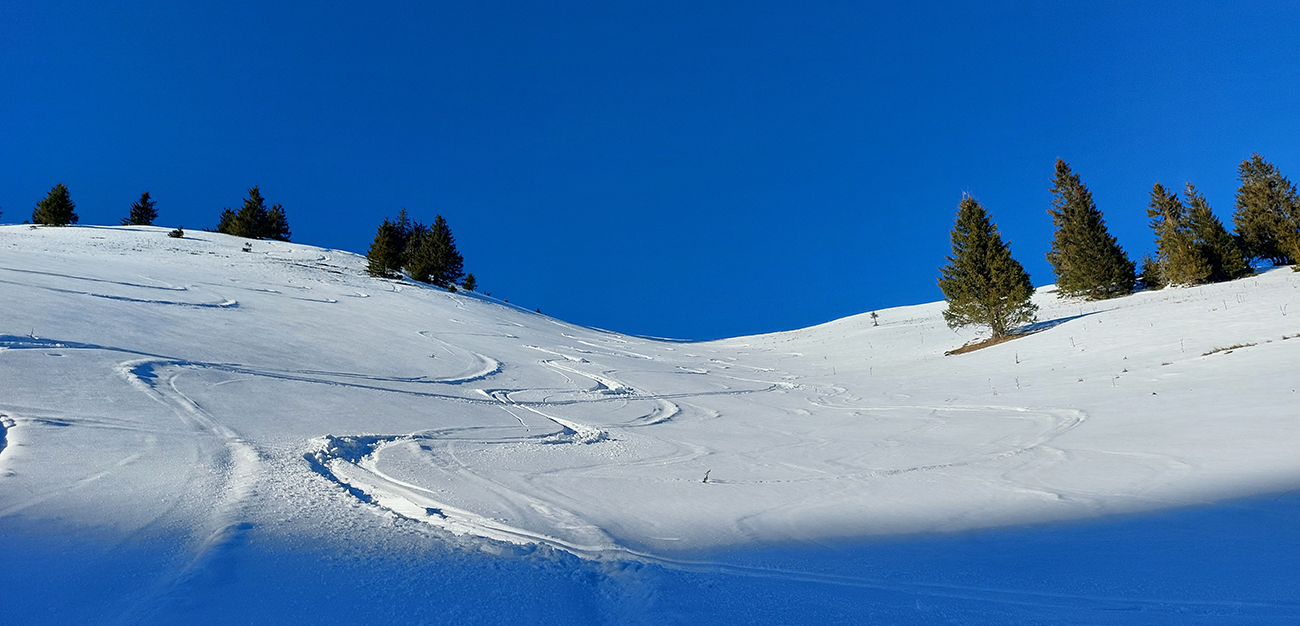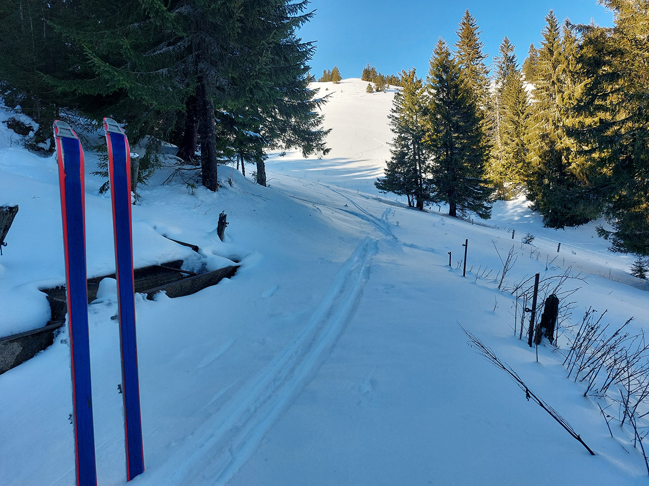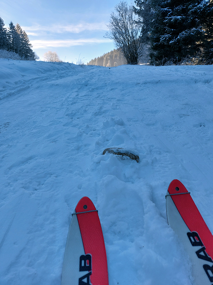 Slnko nízke, ukryté za stromami, prášku (kolo obeda už troooošku vlhnúceho) tak 10 cm, pod tým niečo staršie a hutnejšie, no fakt lepšia voľba ako striedať lepidlo a vatu na hrebeni smerom na Smrekovicu. Krátke síce, ale parádne lyžby, každá dĺžkou tak akurát na jeden záťah.