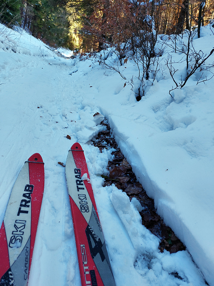 Tak už len odjazd – cestou pod Vtáčnik mi to išlo (mám dojem) lepšie na pásoch po tej špine napadanej zo stromov, ako na sklzniciach, už zbavených vosku. Cesta k Mederličke ešte zúfalejšia ako ráno a za chatou ten krátky úsek hustým lesom na zjazdovku čisté zúfalstvo – viac hnedej ako bielej. Pozajtra tam budú hríby rásť. Takže už len po umeláku, po zjazdovkách, odjazd dole. Aspoň v tomto je to Malino super.