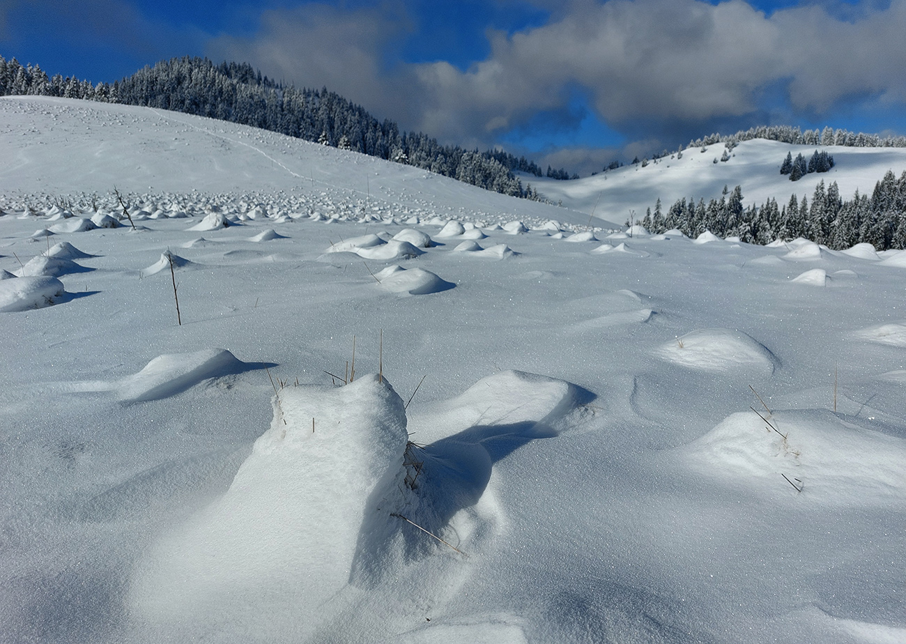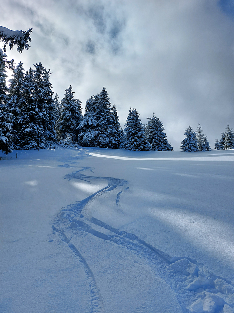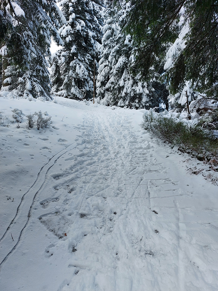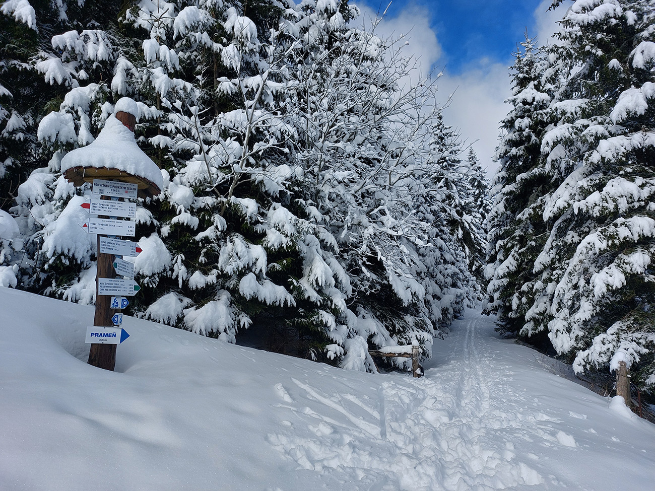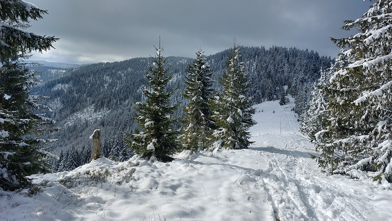 Na lúkach na cyklotrase medzi Vtáčnikom a Šiprúnskymi sedlami to vyzeralo rozprávkovo, ale hroty palíc klopali o zem a kôpky prisnežených trávových trsov žalovali o nízkej hladine snehu. Niekde naviatych aj 20 cm, no na viacerých miestach pod hustejšími korunami ledva cenťáčik a smejúce sa pirane.