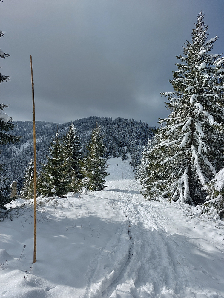 Takže nazad a na prekvapenie relatívne v pohode aj dole brehom, ani som v strmšom vyzúvať nemusel, na pásoch ma čerstvý sneh tak akurát dobrzďoval. Južné orientácie už ale okolo obeda začali vlhnúť, dvíhajúci sa vietor sa postaral o „sekundárne sneženie“ a miestami sa ozvalo aj poriadne žuchnutie, keď niektorý strom zhodil väčšiu čapicu. Pohľad doprava, do diaľky, ukazoval tragicky sivé rúbaniská na severných svahoch Nízkych Tatier: